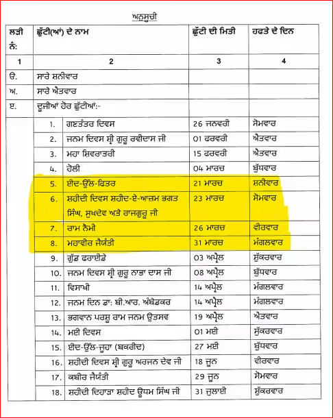 26 ਤੇ 31 ਮਾਰਚ ਨੂੰ ਵੀ ਛੁੱਟੀ