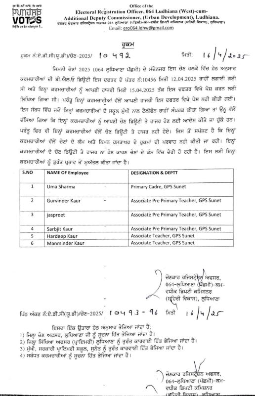 12 ਅਪ੍ਰੈਲ ਨੂੰ ਚੋਣ ਰਜਿਸਟ੍ਰੇਸ਼ਨ ਅਫ਼ਸਰ ਰੁਪਿੰਦਰ ਸਿੰਘ ਨੇ ਹੁਕਮ ਜਾਰੀ ਕਰ ਕੇ ਸਰਕਾਰੀ ਪ੍ਰਾਇਮਰੀ ਸਕੂਲ ਸੁਨੇਤ ਤੋਂ ਅਧਿਆਪਕਾ ਉਮਾ ਸ਼ਰਮਾ, ਗੁਰਵਿੰਦਰ ਕੌਰ, ਜਸਪ੍ਰੀਤ, ਸਰਬਜੀਤ ਕੌਰ, ਹਰਦੀਪ ਕੌਰ ਅਤੇ ਮਨਮਿੰਦਰ ਕੌਰ ਨੂੰ ਚੋਣ ਦਫ਼ਤਰ ਵਿੱਚ ਤਾਇਨਾਤ ਕੀਤਾ ਸੀ।