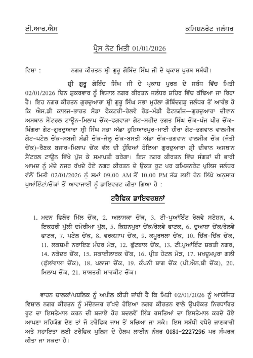 ਨਗਰ ਕੀਰਤਨ ਵਿੱਚ ਸੰਗਤਾਂ ਦੀ ਭਾਰੀ ਆਮਦ ਦੀ ਮੱਦੇਨਜ਼ਰ ਨਗਰ ਕੀਰਤਨ ਦੇ ਉਕਤ ਰੂਟ ਉਤੇ ਕਮਿਸ਼ਨਰੇਟ ਪੁਲਿਸ ਜਲੰਧਰ ਵੱਲੋਂ 02 ਜਨਵਰੀ 2026 ਨੂੰ ਸਵੇਰੇ 09.00 ਤੋਂ ਰਾਤ 10.00 ਵਜੇ ਤੱਕ ਇਨ੍ਹਾਂ ਪੁਆਂਇੰਟਾਂ/ਚੋਂਕਾਂ ਤੋਂ ਆਵਾਜਾਈ ਨੂੰ ਡਾਇਵਰਟ ਕੀਤਾ ਗਿਆ ਹੈ, ਜਿਨ੍ਹਾਂ ਵਿਚ 1. ਮਦਨ ਫਿਲੋਰ ਮਿੱਲ ਚੋਂਕ, 2. ਅਲਾਸਕਾ ਚੋਂਕ, 3. ਟੀ-ਪੁਆਂਇੰਟ ਰੇਲਵੇ ਸਟੇਸ਼ਨ, 4. ਇਕਹਰੀ ਪੁੱਲੀ ਦਮੋਰੀਆ ਪੁੱਲ, 5. ਕਿਸ਼ਨਪੁਰਾ ਚੋਂਕ/ਰੇਲਵੇ ਫਾਟਕ, 6. ਦੁਆਬਾ ਚੋਂਕ/ਰੇਲਵੇ ਫਾਟਕ, 7. ਪਟੇਲ ਚੋਂਕ, 8. ਵਰਕਸ਼ਾਪ ਚੋਂਕ, 9. ਕਪੂਰਥਲਾ ਚੋਂਕ, 10. ਚਿੱਕ-ਚਿੱਕ ਚੋਂਕ, 11. ਲਕਸ਼ਮੀ ਨਰਾਇਣ ਮੰਦਰ ਮੋੜ, 12. ਫੁੱਟਬਾਲ ਚੌਂਕ, 13, ਟੀ.ਪੁਆਂਇੰਟ ਸ਼ਕਤੀ ਨਗਰ, 14. ਨਕੋਦਰ ਚੌਂਕ, 15. ਸਕਾਈਲਾਰਕ ਚੋਂਕ, 16, ਪ੍ਰੀਤ ਹੋਟਲ ਮੋੜ, 17. ਮਖਦੂਮਪੁਰਾ ਗਲੀ (ਫੁੱਲਾਂਵਾਲਾ ਚੌਂਕ), 18. ਪਲਾਜਾ ਚੋਂਕ, 19. ਕੰਪਨੀ ਬਾਗ ਚੋਂਕ (ਪੀ.ਐਨ.ਬੀ ਚੌਂਕ), 20, ਮਿਲਾਪ ਚੌਂਕ, 21. ਸ਼ਾਸ਼ਤਰੀ ਮਾਰਕੀਟ ਚੋਂਕ ਸ਼ਾਮਲ ਹਨ।