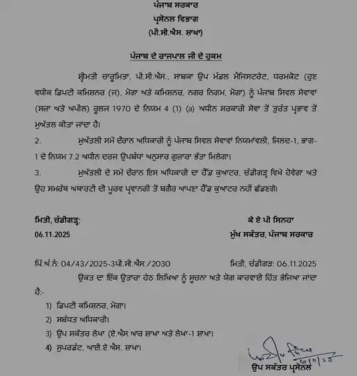 ਮੋਗਾ ਦੇ ਜ਼ਿਲ੍ਹੇ ਦੇ ਡਿਪਟੀ ਕਮਿਸ਼ਨਰ ਚਾਰੂਮਿਤਾ ਨੂੰ ਸਸਪੈਂਡ ਕਰਨ ਦਾ ਮਾਮਲਾ ਸਾਹਮਣੇ ਆਇਆ ਹੈ। ਸਰਕਾਰ ਨੇ ਏਡੀਸੀ ਅਤੇ ਨਗਰ ਨਿਗਮ ਕਮਿਸ਼ਨਰ ਚਾਰੂਮਿਤਾ ਨੂੰ ਮੁਅੱਤਲ ਕਰ ਦਿੱਤਾ ਹੈ। ਮੁੱਖ ਸਕੱਤਰ ਨੇ ਪੰਜਾਬ ਸਿਵਲ ਸੇਵਾਵਾਂ (ਸਜ਼ਾ ਅਤੇ ਅਪੀਲ) ਨਿਯਮ, 1970 ਦਾ ਹਵਾਲਾ ਦਿੱਤਾ। ਦੱਸਿਆ ਜਾ ਰਿਹਾ ਹੈ ਕਿ ਇਹ ਕਾਰਵਾਈ ਜ਼ਮੀਨ ਗਬਨ ਦੇ ਦੋਸ਼ਾਂ ਵਿੱਚ ਕੀਤੀ ਗਈ ਹੈ।