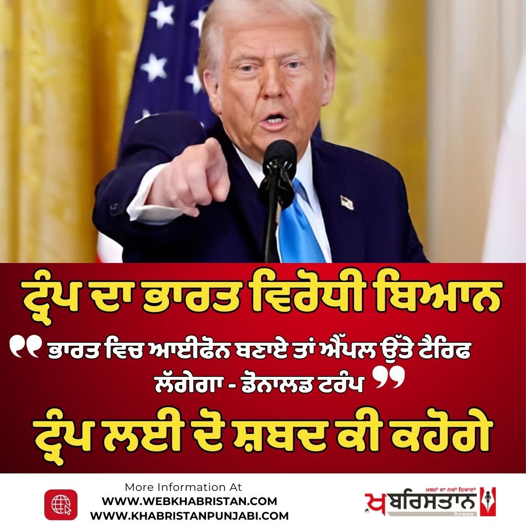 ਖ਼ਬਰਿਸਤਾਨ ਨੈੱਟਵਰਕ: ਅਮਰੀਕੀ ਰਾਸ਼ਟਰਪਤੀ ਡੋਨਾਲਡ ਟਰੰਪ ਨੇ ਇੱਕ ਵਾਰ ਫਿਰ ਐਪਲ ਨੂੰ ਚੇਤਾਵਨੀ ਦਿੱਤੀ ਹੈ| ਉਨ੍ਹਾਂ ਨੇ ਕਿਹਾ ਕਿ ਅਮਰੀਕਾ ਵਿੱਚ ਵੇਚੇ ਜਾਣ ਵਾਲੇ ਆਈਫੋਨ ਅਮਰੀਕਾ ਵਿੱਚ ਹੀ ਬਣਾਏ ਜਾਣੇ ਚਾਹੀਦੇ ਹਨ ਨਾ ਕਿ ਭਾਰਤ ਜਾਂ ਕਿਸੇ ਹੋਰ ਦੇਸ਼ ਵਿੱਚ। ਉਨ੍ਹਾਂ ਚੇਤਾਵਨੀ ਦਿੱਤੀ ਕਿ ਜੇਕਰ ਅਜਿਹਾ ਨਹੀਂ ਹੁੰਦਾ, ਤਾਂ ਐਪਲ ਨੂੰ ਅਮਰੀਕਾ ਵਿੱਚ ਹਰੇਕ ਆਈਫੋਨ ‘ਤੇ ਘੱਟੋ-ਘੱਟ 25 ਪ੍ਰਤੀਸ਼ਤ ਟੈਰਿਫ ਦੇਣਾ ਪਵੇਗਾ। ਟਰੰਪ ਨੇ ਖੁਦ ਇਹ ਗੱਲ ਪਹਿਲਾਂ ਐਪਲ ਦੇ ਸੀਈਓ ਟਿਮ ਕੁੱਕ ਨੂੰ ਕਹੀ ਸੀ, ਅਤੇ ਹੁਣ ਉਨ੍ਹਾਂ ਨੇ ਇਸਨੂੰ ਜਨਤਕ ਤੌਰ ‘ਤੇ ਦੁਬਾਰਾ ਦੁਹਰਾਇਆ ਹੈ।