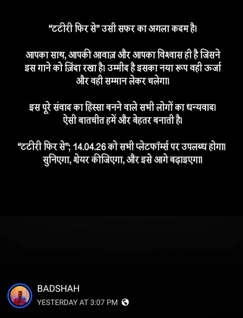 ਗਾਇਕ ਨੇ ਸੋਸ਼ਲ ਮੀਡੀਆ ‘ਤੇ ਦੋ ਪੋਸਟਾਂ ਸ਼ੇਅਰ ਕਰਦਿਆਂ ਲਿਖਿਆ ਕਿ ਟਟੀਰੀ ਫਿਰ ਸੇ” ਉਸੇ ਸਫ਼ਰ ਦਾ ਅਗਲਾ ਕਦਮ ਹੈ। ਤੁਹਾਡਾ ਸਾਥ, ਤੁਹਾਡੀ ਆਵਾਜ਼ ਅਤੇ ਤੁਹਾਡਾ ਵਿਸ਼ਵਾਸ ਹੀ ਹੈ ਜਿਸਨੇ ਇਸ ਗਾਣੇ ਨੂੰ ਜ਼ਿੰਦਾ ਰੱਖਿਆ ਹੈ। ਉਮੀਦ ਹੈ ਇਸਦਾ ਨਵਾਂ ਰੂਪ ਉਹੀ ਊਰਜਾ ਅਤੇ ਉਹੀ ਸਨਮਾਨ ਲੈ ਕੇ ਚੱਲੇਗਾ।