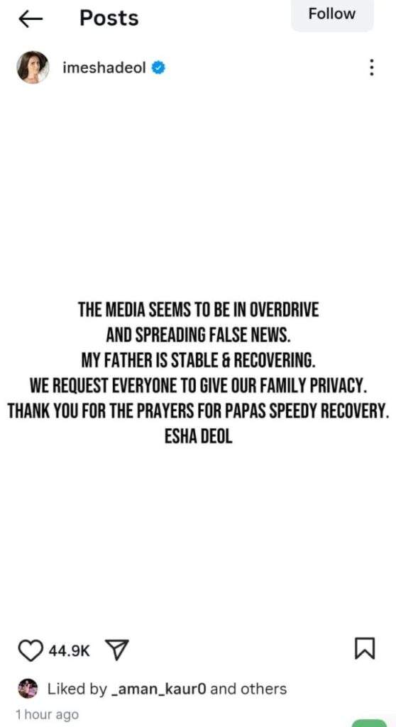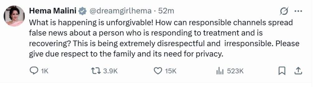 ਖ਼ਬਰਾਂ ‘ਤੇ ਆਪਣੀ ਨਾਰਾਜ਼ਗੀ ਜ਼ਾਹਰ ਕਰਦੇ ਹੋਏ, ਹੇਮਾ ਮਾਲਿਨੀ ਨੇ ਸੋਸ਼ਲ ਮੀਡੀਆ ‘ਤੇ ਇਹ ਵੀ ਲਿਖਿਆ, “ਜੋ ਹੋ ਰਿਹਾ ਹੈ ਉਹ ਮੁਆਫ਼ ਨਹੀਂ ਕੀਤਾ ਜਾ ਸਕਦਾ। ਜ਼ਿੰਮੇਵਾਰ ਚੈਨਲ ਕਿਸੇ ਅਜਿਹੇ ਵਿਅਕਤੀ ਬਾਰੇ ਝੂਠੀਆਂ ਖ਼ਬਰਾਂ ਕਿਵੇਂ ਫੈਲਾ ਸਕਦੇ ਹਨ ਜੋ ਇਲਾਜ ਪ੍ਰਤੀ ਹੁੰਗਾਰਾ ਭਰ ਰਿਹਾ ਹੈ ਅਤੇ ਠੀਕ ਹੋ ਰਿਹਾ ਹੈ? ਇਹ ਬਹੁਤ ਹੀ ਨਿਰਾਦਰਜਨਕ ਅਤੇ ਗੈਰ-ਜ਼ਿੰਮੇਵਾਰਾਨਾ ਵਿਵਹਾਰ ਹੈ। ਕਿਰਪਾ ਕਰਕੇ ਪਰਿਵਾਰ ਅਤੇ ਉਨ੍ਹਾਂ ਦੀ ਨਿੱਜਤਾ ਦਾ ਸਤਿਕਾਰ ਕਰੋ।”