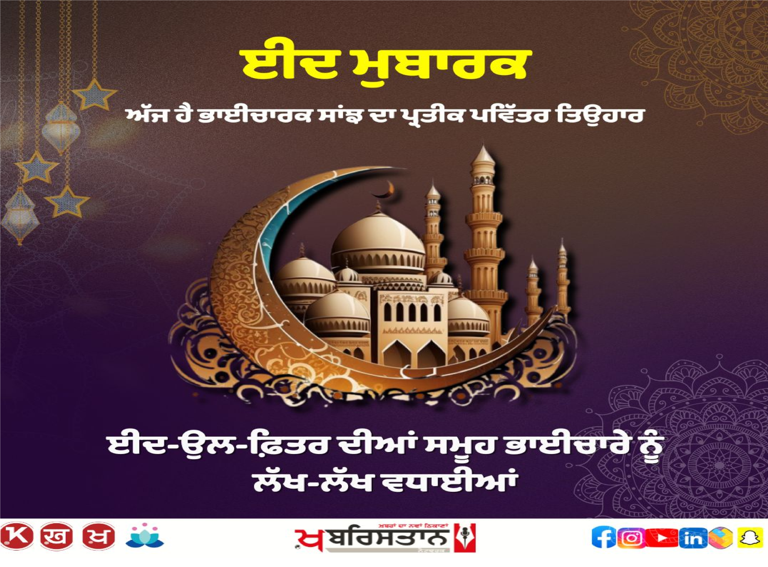 ਆਪਸੀ ਭਾਈਚਾਰੇ ਅਤੇ ਏਕਤਾ ਦੇ ਪ੍ਰਤੀਕ ਤਿਉਹਾਰ ਈਦ-ਉੱਲ-ਫ਼ਿਤਰ ਦੀਆਂ ਸਮੂਹ ਮੁਸਲਿਮ ਭਾਈਚਾਰੇ ਨੂੰ ਬਹੁਤ-ਬਹੁਤ ਮੁਬਾਰਕਾਂ। ਅੱਲ੍ਹਾ ਸਾਰਿਆਂ ‘ਤੇ ਸਦਾ ਆਪਣਾ ਰਹਿਮਤ ਭਰਿਆ ਹੱਥ ਰੱਖਣ। ਸਾਂਝੀਵਾਲਤਾ ਬਣੀ ਰਹੇ ਤੇ ਅਸੀਂ ਇਸੇ ਤਰ੍ਹਾਂ ਰਲ-ਮਿਲ ਕੇ ਤਿਉਹਾਰ ਮਨਾਉਂਦੇ ਰਹੀਏ। pic.twitter.com/2eajpvroQg
