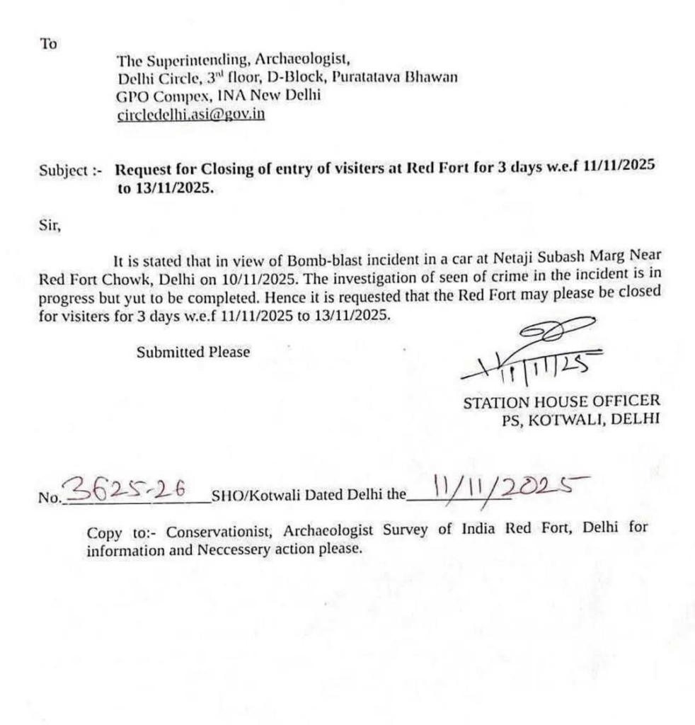 ਦਿੱਲੀ ਪੁਲਿਸ ਦੇ ਸੂਤਰਾਂ ਅਨੁਸਾਰ, ਲਾਲ ਕਿਲ੍ਹਾ ਅਗਲੇ ਨੋਟਿਸ ਤੱਕ ਬੰਦ ਰਹੇਗਾ। ਜਾਂਚ ਵਿੱਚ ਰੁਕਾਵਟ ਨਾ ਆਉਣ ਨੂੰ ਯਕੀਨੀ ਬਣਾਉਣ ਲਈ ਸੈਲਾਨੀਆਂ ਅਤੇ ਆਮ ਨਾਗਰਿਕਾਂ ਲਈ ਲਾਲ ਕਿਲ੍ਹੇ ਵਿੱਚ ਦਾਖਲਾ ਸੀਮਤ ਰਹੇਗਾ। ਇਹ ਫੈਸਲਾ ਰਾਸ਼ਟਰੀ ਸੁਰੱਖਿਆ ਗਾਰਡ (NSG), ਰਾਸ਼ਟਰੀ ਜਾਂਚ ਏਜੰਸੀ (NIA) ਅਤੇ ਫੋਰੈਂਸਿਕ ਟੀਮਾਂ ਦੀ ਮੌਜੂਦਗੀ ਕਾਰਨ ਲਿਆ ਗਿਆ।