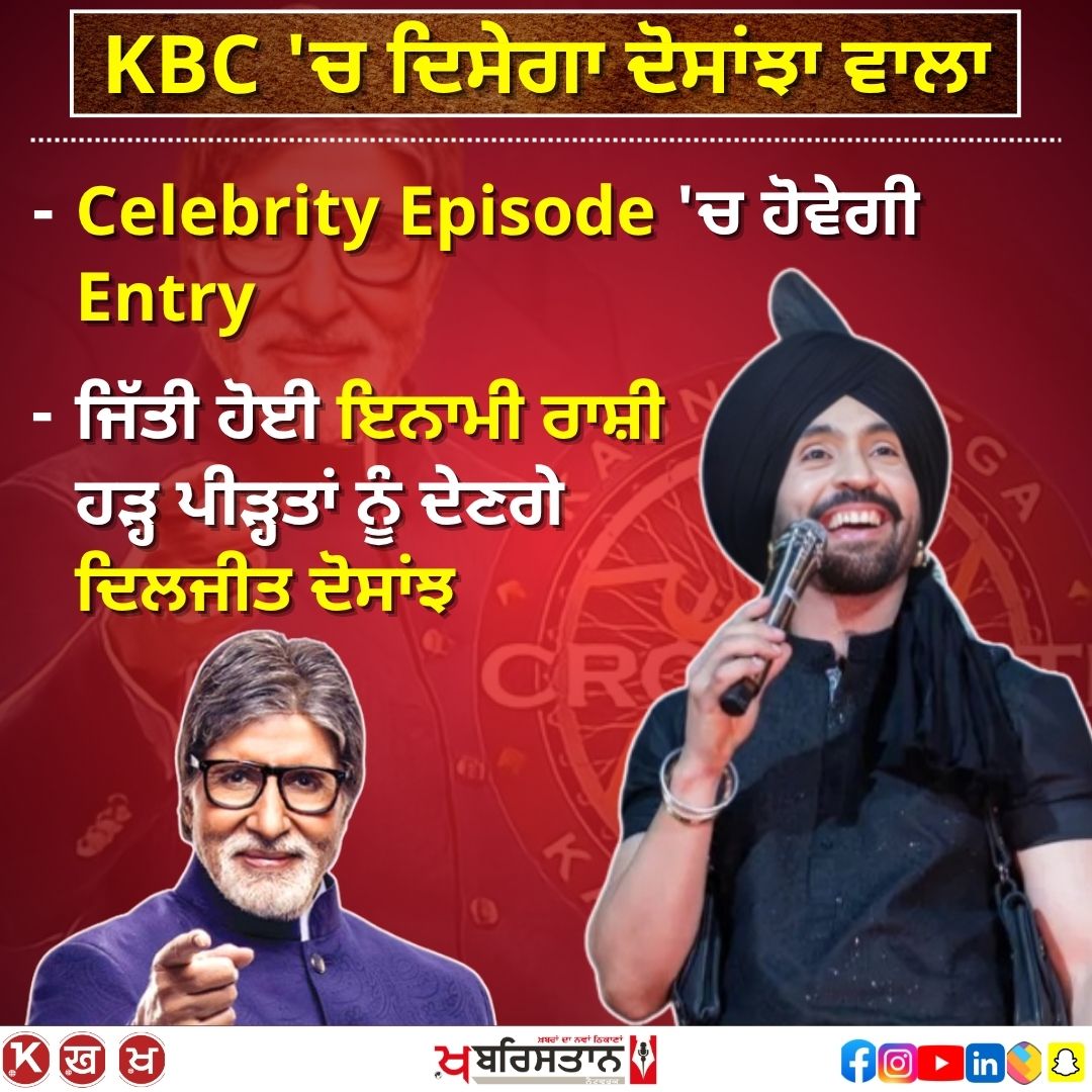 ਖਬਰਿਸਤਾਨ ਨੈੱਟਵਰਕ- ਪੰਜਾਬੀ ਗਾਇਕ ਤੇ ਅਦਾਕਾਰ ਦਿਲਜੀਤ ਦੋਸਾਂਝ ਜਲਦੀ ਹੀ ਮਸ਼ਹੂਰ ਟੈਲੀਵਿਜ਼ਨ ਸ਼ੋਅ ‘ਕੌਣ ਬਣੇਗਾ ਕਰੋੜਪਤੀ 17’ (KBC 17) ‘ਚ ਅਮਿਤਾਭ ਬੱਚਨ ਦੇ ਨਾਲ ਹੌਟ ਸੀਟ ‘ਤੇ ਨਜ਼ਰ ਆਉਣਗੇ। ਸ਼ੋਅ ਵਿਚ ਜਿੱਤੀ ਹੋਈ ਇਨਾਮੀ ਰਾਸ਼ੀ ਦਿਲਜੀਤ ਦੋਸਾਂਝ ਹੜ੍ਹ ਪੀੜ੍ਹਤਾਂ ਨੂੰ ਦੇਣਗੇ।