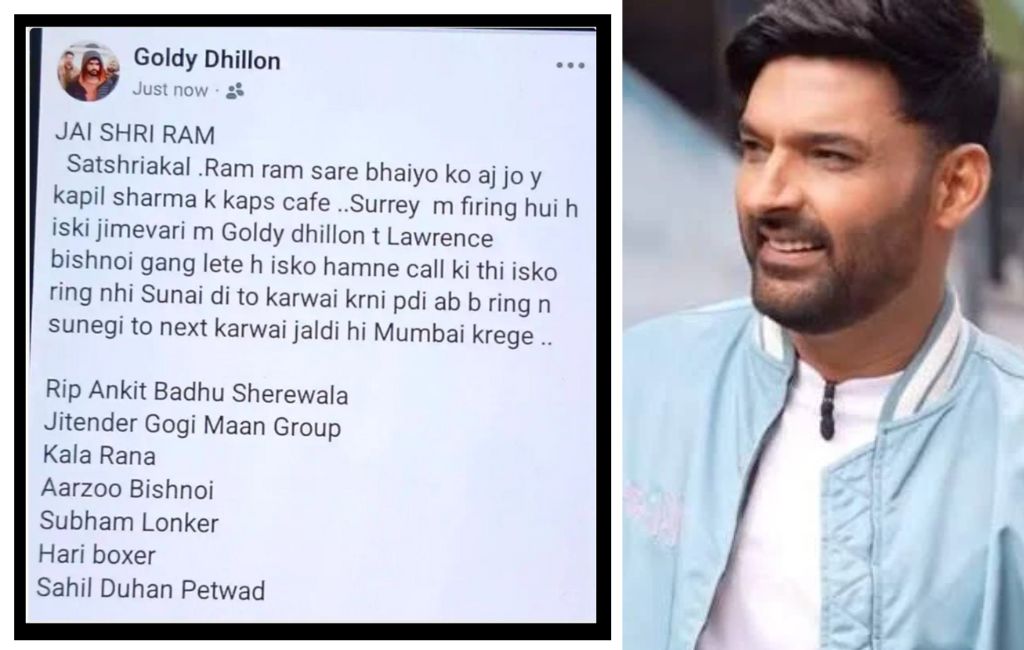 ਜੈ ਸ਼੍ਰੀ ਰਾਮ, ਸਤਿ ਸ਼੍ਰੀ ਅਕਾਲ, ਰਾਮ ਰਾਮ ਸਾਰੇ ਭਰਾਵਾਂ ਨੂੰ। ਮੈਂ, ਗੋਲਡੀ ਢਿੱਲੋਂ ਅਤੇ ਲਾਰੈਂਸ ਅੱਜ ਕਪਿਲ ਸ਼ਰਮਾ ਦੇ ਕੈਪਸ ਕੈਫੇ ਵਿੱਚ ਹੋਈ ਗੋਲੀਬਾਰੀ ਦੀ ਜ਼ਿੰਮੇਵਾਰੀ ਲੈਂਦੇ ਹਾਂ। ਅਸੀਂ ਉਸਨੂੰ ਫੋਨ ਕੀਤਾ। ਉਸਨੇ ਰਿੰਗ ਨਹੀਂ ਸੁਣੀ, ਇਸ ਲਈ ਸਾਨੂੰ ਕਾਰਵਾਈ ਕਰਨੀ ਪਈ। ਜੇਕਰ ਉਸਨੂੰ ਫਿਰ ਵੀ ਰਿੰਗ ਨਹੀਂ ਸੁਣਾਈ ਦਿੱਤੀ, ਤਾਂ ਅਸੀਂ ਜਲਦੀ ਹੀ ਮੁੰਬਈ ਵਿੱਚ ਅਗਲੀ ਕਾਰਵਾਈ ਕਰਾਂਗੇ।