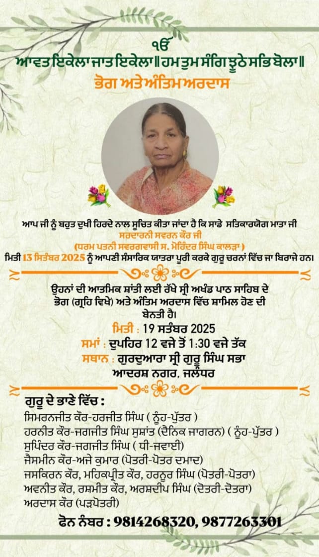 ਖਬਰਿਸਤਾਨ ਨੈੱਟਵਰਕ- ਆਪ ਜੀ ਨੂੰ ਬਹੁਤ ਦੁਖੀ ਹਿਰਦੇ ਨਾਲ ਸੂਚਿਤ ਕੀਤਾ ਜਾਂਦਾ ਹੈ ਕਿ ਸਾਡੇ ਸਤਿਕਾਰਯੋਗ ਮਾਤਾ ਜੀ ਸਰਦਾਰਨੀ ਸਵਰਨ ਕੌਰ ਜੀ (ਧਰਮ ਪਤਨੀ ਸਵਰਗਵਾਸੀ ਸ. ਮੋਹਿੰਦਰ ਸਿੰਘ ਕਾਲੜਾ ) ਮਿਤੀ 13 ਸਤੰਬਰ 2025 ਨੂੰ ਆਪਣੀ ਸੰਸਾਰਿਕ ਯਾਤਰਾ ਪੂਰੀ ਕਰ ਕੇ ਗੁਰੂ ਚਰਨਾਂ ਵਿੱਚ ਜਾ ਬਿਰਾਜੇ ਸਨ। ਉਹਨਾਂ ਦੀ ਆਤਮਿਕ ਸ਼ਾਂਤੀ ਲਈ ਰੱਖੇ ਸ੍ਰੀ ਅਖੰਡ ਪਾਠ ਸਾਹਿਬ ਦੇ ਭੋਗ (ਗ੍ਰਹਿ ਵਿਖੇ) ਅਤੇ ਅੰਤਿਮ ਅਰਦਾਸ ਵਿੱਚ ਸ਼ਾਮਲ ਹੋਣ ਦੀ ਆਪ ਸਭ ਨੂੰ ਬੇਨਤੀ ਕੀਤੀ ਜਾਂਦੀ ਹੈ।