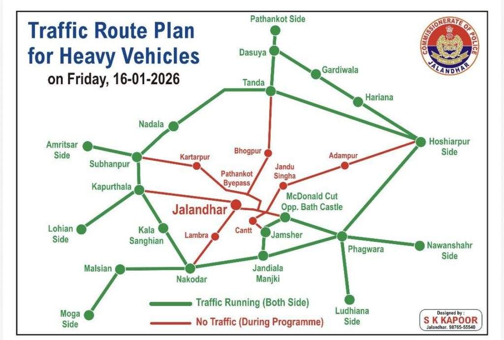 ਜਲੰਧਰ ‘ਚ ਅੱਜ ਮਾਨਯੋਗ ਰਾਸ਼ਟਰਪਤੀ ਦੇ ਦੌਰੇ ਦੇ ਮੱਦੇਨਜ਼ਰ ਸ਼ਹਿਰ ਦੇ ਕਈ ਰਸਤੇ ਭਾਰੀ ਵਾਹਨਾਂ ਲਈ ਬੰਦ ਰਹਿਣਗੇ। ਇਸ ਸੰਬੰਧੀ ਪੁਲਿਸ ਕਮਿਸ਼ਨਰੇਟ ਜਲੰਧਰ ਨੇ ਟ੍ਰੈਫਿਕ ਯੋਜਨਾ ਜਾਰੀ ਕੀਤੀ ਹੈ।