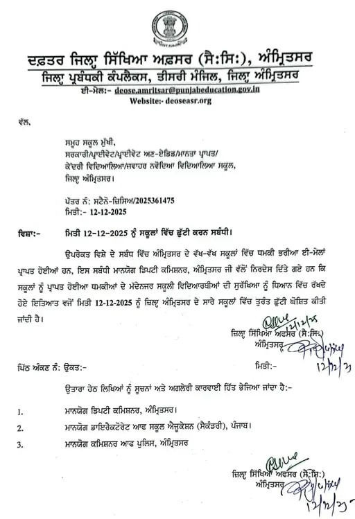 ਖਬਰਿਸਤਾਨ ਨੈੱਟਵਰਕ- ਅੰਮ੍ਰਿਤਸਰ ਵਿਚ ਕੁੱਝ ਪ੍ਰਾਈਵੇਟ ਸਕੂਲਾਂ ਨੂੰ ਮਿਲੀਆਂ ਬੰਬ ਨਾਲ ਉਡਾਉਣ ਦੀਆਂ ਧਮਕੀਆਂ ਤੋਂ ਬਾਅਦ ਡੀ ਸੀ ਅੰਮ੍ਰਿਤਸਰ ਦੇ ਸਾਰੇ ਸਕੂਲਾਂ ਵਿਚ ਛੁੱਟੀ ਦਾ ਐਲਾਨ ਕਰ ਦਿੱਤਾ ਹੈ।ਇਸ ਸਬੰਧੀ ਡਿਪਟੀ ਕਮਿਸ਼ਨਰ ਵਲੋਂ ਇਕ ਨੋਟੀਫਿਕੇਸ਼ਨ ਜਾਰੀ ਕੀਤਾ ਗਿਆ ਹੈ।