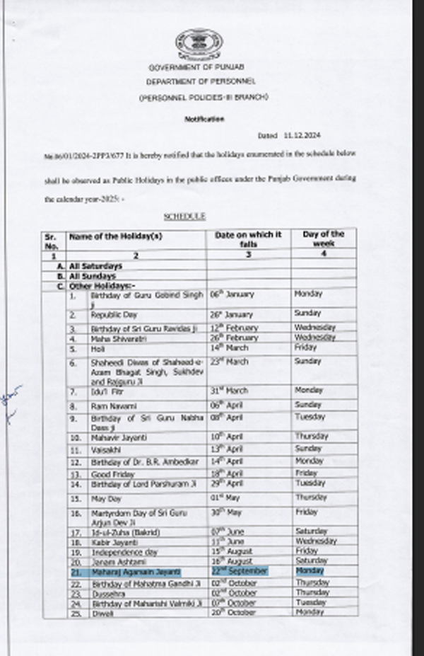 ਖਬਰਿਸਤਾਨ ਨੈੱਟਵਰਕ- ਪੰਜਾਬ ਸਰਕਾਰ ਵਲੋਂ ਇਕ ਹੋਰ ਛੁੱਟੀ ਦਾ ਐਲਾਨ ਕੀਤਾ ਗਿਆ ਹੈ। ਦੱਸ ਦੇਈਏ ਕਿ 22 ਸਤੰਬਰ ਸੋਮਵਾਰ ਨੂੰ ਮਹਾਰਾਜਾ ਅਗਰਸੈਨ ਜਯੰਤੀ ਮੌਕੇ ਪੰਜਾਬ ਵਿਚ ਗਜ਼ਟਿਡ ਛੁੱਟੀ ਦਾ ਐਲਾਨ ਕੀਤਾ ਗਿਆ ਹੈ। ਇਸ ਦਿਨ ਪੰਜਾਬ ਵਿਚ ਸਾਰੇ ਸਕੂਲ-ਕਾਲਜ ਬੰਦ ਰਹਿਣਗੇ।