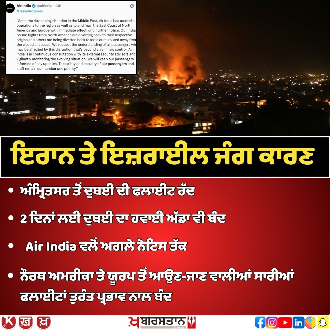 ਖ਼ਬਰਿਸਤਾਨ ਨੈੱਟਵਰਕ: ਈਰਾਨ ਅਤੇ ਇਜ਼ਰਾਇਲ ਵਿਚਕਾਰ ਜੰਗ ਕਾਰਨ ਹਵਾਈ ਖੇਤਰਾਂ ‘ਤੇ ਇਸਦਾ ਪ੍ਰਭਾਵ ਨਜ਼ਰ ਆ ਰਿਹਾ ਹੈ| ਏਅਰਲਾਈਨਜ਼ ਨੇ ਅੰਮ੍ਰਿਤਸਰ ਤੋਂ ਦੁਬਈ ਜਾਣ ਵਾਲੀ ਫਲਾਇਟ ਨੂੰ ਰੱਦ ਕਰ ਦਿੱਤਾ ਹੈ | ਦੋਵਾਂ ਦੇਸ਼ਾਂ ਵਿਚਕਾਰ ਵੱਧਦੇ ਤਣਾਅ ਕਾਰਨ ਹਵਾਈ ਖੇਤਰ ਬੰਦ ਹੋਣ ਕਾਰਨ ਇੰਟਰਨੈਸ਼ਨਲ ਉਡਾਣਾਂ ‘ਤੇ ਅਸਰ ਪੈ ਰਿਹਾ ਹੈ|  ਦੱਸ ਦੇਈਏ ਕਈ 2 ਦਿਨਾਂ ਤੱਕ ਦੁਬਈ ਦਾ ਏਅਰਪੋਰਟ ਬੰਦ ਰਹੇਗਾ |ਨੋਰਥ ਅਮਰੀਕਾ ਅਤੇ ਯੂਰਪ ਤੋਂ ਆਉਣ-ਜਾਣ ਵਾਲੀਆਂ ਫਲਾਇਟਾਂ ਏਅਰ ਇੰਡੀਆ ਦੇ ਅਗਲੇ ਹੁਕਮਾਂ ਤਕ ਬੰਦ ਰਹਿਣਗੀਆਂ |