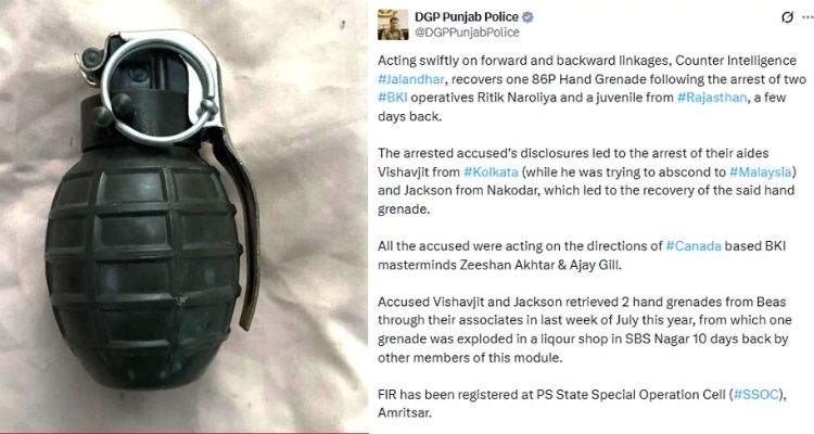 ਜਲੰਧਰ ਕਾਊਂਟਰ ਇੰਟੈਲੀਜੈਂਸ ਟੀਮ ਨੇ ਅੱਤਵਾਦੀ ਘਟਨਾ ਨੂੰ ਅੰਜਾਮ ਦੇਣ ਤੋਂ ਪਹਿਲਾਂ ਹੀ ਇੱਕ ਵੱਡੀ ਸਾਜ਼ਿਸ਼ ਨੂੰ ਨਾਕਾਮ ਕਰ ਦਿੱਤਾ। ਟੀਮ ਨੇ ਬੀਕੇਆਈ (ਬੱਬਰ ਖਾਲਸਾ ਇੰਟਰਨੈਸ਼ਨਲ) ਦੇ ਕਾਰਕੁਨਾਂ ਤੋਂ ਪੁੱਛਗਿੱਛ ਦੇ ਆਧਾਰ ‘ਤੇ ਇੱਕ 86P ਹੈਂਡ ਗ੍ਰਨੇਡ ਬਰਾਮਦ ਕੀਤਾ। ਹਾਲ ਹੀ ਵਿੱਚ, ਕਾਊਂਟਰ ਇੰਟੈਲੀਜੈਂਸ ਨੇ ਰਾਜਸਥਾਨ ਨਿਵਾਸੀ ਅੱਤਵਾਦੀ ਰਿਤਿਕ ਨਰੋਲੀਆ ਅਤੇ ਇੱਕ ਨਾਬਾਲਗ ਨੂੰ ਗ੍ਰਿਫਤਾਰ ਕੀਤਾ। ਉਨ੍ਹਾਂ ਦੀ ਪੁੱਛਗਿੱਛ ਤੋਂ ਮਿਲੀ ਜਾਣਕਾਰੀ ‘ਤੇ ਅਗਲੇਰੀ ਕਾਰਵਾਈ ਕਰਦੇ ਹੋਏ, ਪੁਲਿਸ ਨੇ ਉਨ੍ਹਾਂ ਦੇ ਸਾਥੀਆਂ ਨੂੰ ਵੀ ਫੜ ਲਿਆ।
