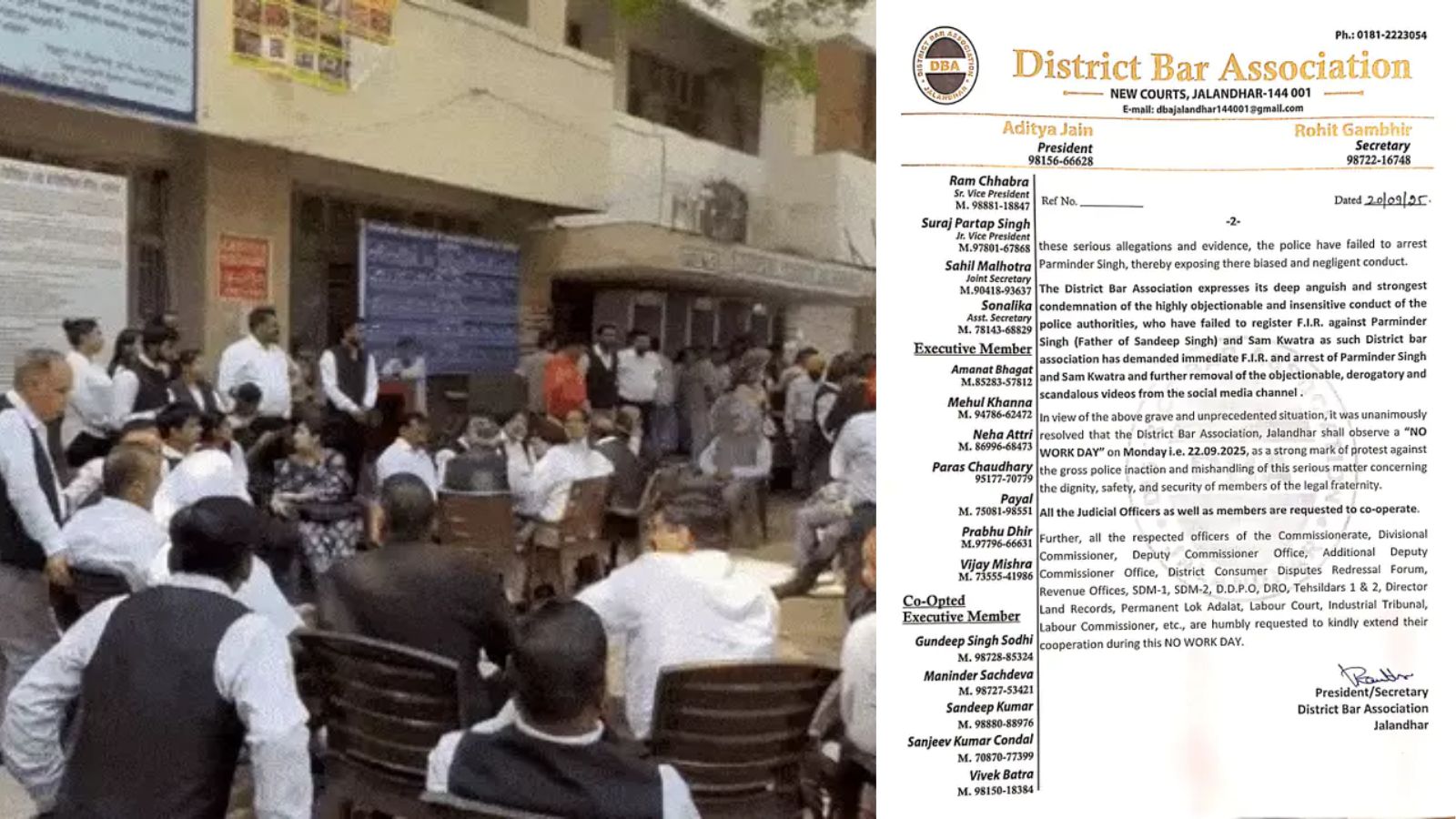 ਬਾਰ ਐਸੋਸੀਏਸ਼ਨ ਨੇ ਪੁਲਿਸ ‘ਤੇ ਦੋਸ਼ ਲਗਾਇਆ ਹੈ ਕਿ ਪੂਰੇ ਸਬੂਤ ਹੋਣ ਦੇ ਬਾਵਜੂਦ ਪਰਵਿੰਦਰ ਸਿੰਘ ਨੂੰ ਗ੍ਰਿਫ਼ਤਾਰ ਨਹੀਂ ਕੀਤਾ ਗਿਆ ਅਤੇ ਸੈਮ ਕਵਾਤਰਾ ਖ਼ਿਲਾਫ਼ ਕੇਸ ਦਰਜ ਨਹੀਂ ਕੀਤਾ ਗਿਆ। ਪੁਲਿਸ ਇਸ ਮਾਮਲੇ ਵਿੱਚ ਨਿਰਪੱਖ ਜਾਂਚ ਕਰਨ ਵਿੱਚ ਅਸਫਲ ਰਹੀ ਹੈ, ਜਿਸ ਕਾਰਨ ਉਨ੍ਹਾਂ ਨੂੰ ਇਹ ਕਦਮ ਚੁੱਕਣ ਲਈ ਮਜਬੂਰ ਹੋਣਾ ਪਿਆ।