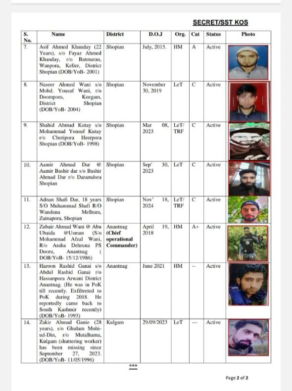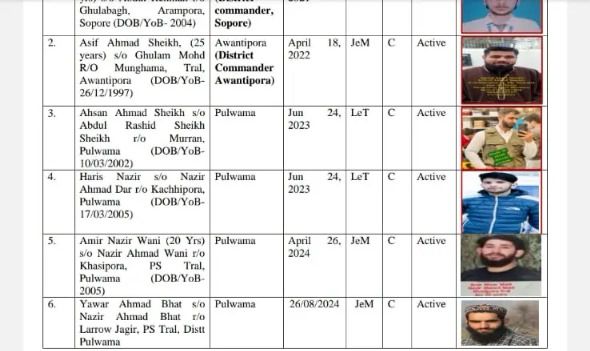 ਤੁਹਾਨੂੰ ਦੱਸ ਦੇਈਏ ਕਿ ਇਨ੍ਹਾਂ ਵਿੱਚੋਂ ਲਸ਼ਕਰ ਦਾ ਇੱਕ ਅੱਤਵਾਦੀ ਸੋਪੋਰ ਵਿੱਚ ਸਰਗਰਮ ਹੈ, ਜੈਸ਼ ਦਾ ਇੱਕ ਅੱਤਵਾਦੀ ਅਵੰਤੀਪੁਰਾ ਵਿੱਚ ਸਰਗਰਮ ਹੈ, ਲਸ਼ਕਰ ਅਤੇ ਜੈਸ਼ ਦੇ ਦੋ-ਦੋ ਸਥਾਨਕ ਅੱਤਵਾਦੀ ਪੁਲਵਾਮਾ ਵਿੱਚ ਸਰਗਰਮ ਹਨ। ਸ਼ੋਪੀਆਂ ਵਿੱਚ ਇੱਕ ਹਿਜ਼ਬੁਲ ਅਤੇ ਚਾਰ ਲਸ਼ਕਰ ਅੱਤਵਾਦੀ ਸਰਗਰਮ ਹਨ। ਇਸ ਦੇ ਨਾਲ ਹੀ, ਹਿਜ਼ਬੁਲ ਦੇ ਦੋ ਸਥਾਨਕ ਅੱਤਵਾਦੀ ਅਨੰਤਨਾਗ ਵਿੱਚ ਸਰਗਰਮ ਦੱਸੇ ਜਾ ਰਹੇ ਹਨ।