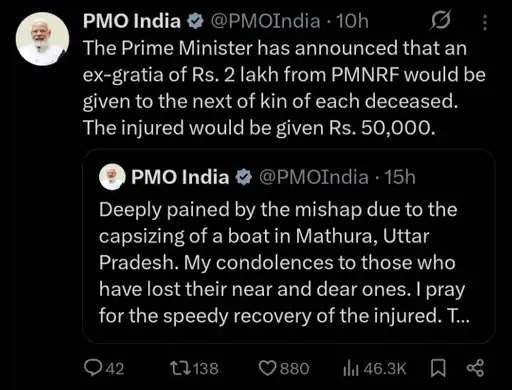 NDRF ਅਤੇ ਫੌਜ ਦੀਆਂ ਟੀਮਾਂ ਤਾਇਨਾਤ ਹਨ। ਫੌਜ ਨੇ ਸ਼ੁੱਕਰਵਾਰ ਦੇਰ ਰਾਤ ਉਸ ਕਿਸ਼ਤੀ ਨੂੰ ਬਾਹਰ ਕੱਢ ਲਿਆ ਹੈ, ਜਿਸ ਨਾਲ ਇਹ ਹਾਦਸਾ ਵਾਪਰਿਆ ਸੀ। ਇੱਕ ਮੁਟਿਆਰ ਸਮੇਤ 5 ਲੋਕ ਅਜੇ ਵੀ ਲਾਪਤਾ ਹਨ। ਮ੍ਰਿਤਕਾਂ ਵਿੱਚ ਇੱਕੋ ਪਰਿਵਾਰ ਦੇ 7 ਲੋਕ ਸ਼ਾਮਲ ਹਨ, ਜਿਨ੍ਹਾਂ ਵਿੱਚ ਮਾਂ-ਪੁੱਤ, ਚਾਚਾ-ਚਾਚੀ ਅਤੇ ਭੂਆ-ਫੁੱਫੜ ਸ਼ਾਮਲ ਹਨ। ਦੱਸ ਦੇਈਏ ਕਿ ਇਹ ਦਰਦਨਾਕ ਹਾਦਸੇ ‘ਤੇ ਪੀ ਐੱਮ ਮੋਦੀ ਨੇ ਦੁਖ ਪ੍ਰਗਟਾਇਆ ਹੈ।