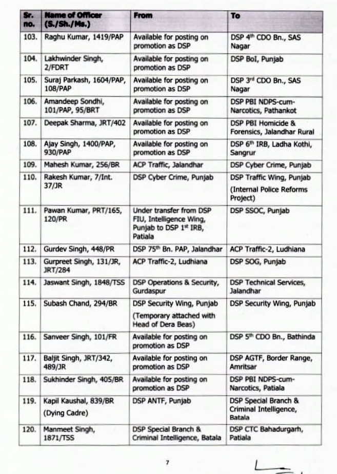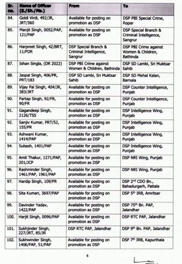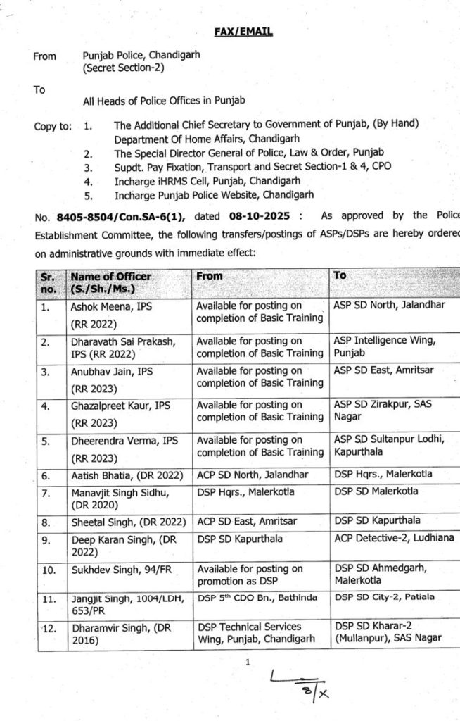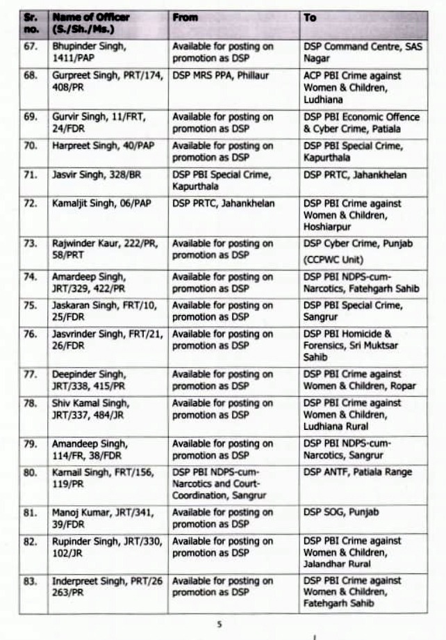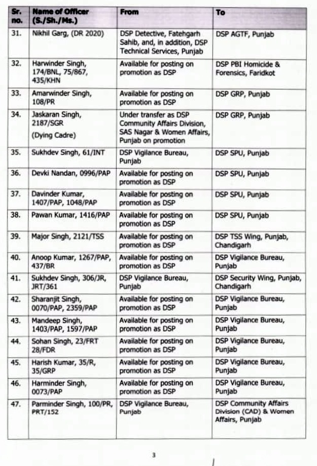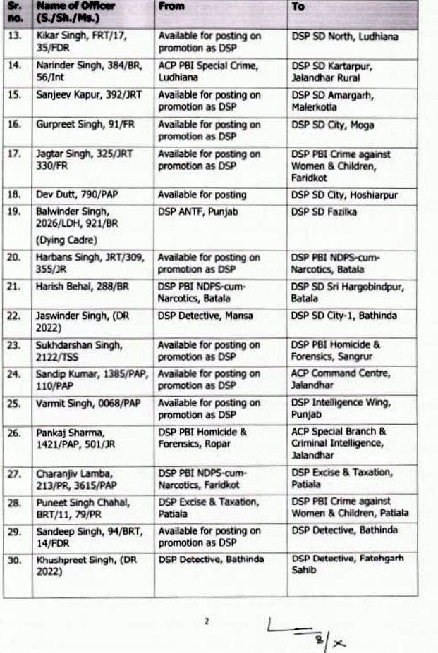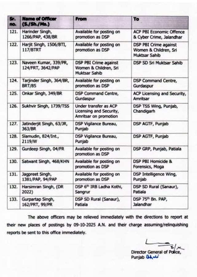 ਖ਼ਬਰਿਸਤਾਨ ਨੈੱਟਵਰਕ: ਪੰਜਾਬ ਪੁਲਿਸ ਨੇ ਇੱਕ ਵਾਰ ਫਿਰ ਏਸੀਪੀ ਅਤੇ ਡੀਐਸਪੀ ਰੈਂਕ ਦੇ ਅਧਿਕਾਰੀਆਂ ਸਮੇਤ ਅਧਿਕਾਰੀਆਂ ਦੇ ਵੱਡੇ ਪੱਧਰ ‘ਤੇ ਤਬਾਦਲੇ ਕੀਤੇ ਹਨ। 133 ਅਧਿਕਾਰੀਆਂ ਦੇ ਤਬਾਦਲੇ ਦੇ ਹੁਕਮ ਜਾਰੀ ਕੀਤੇ ਗਏ ਹਨ, ਜਿਨ੍ਹਾਂ ਵਿੱਚ ਵਿਜੀਲੈਂਸ ਬਿਊਰੋ ਅਤੇ ਰੋਡ ਸੇਫਟੀ ਫੋਰਸ ਸਮੇਤ ਵੱਖ-ਵੱਖ ਵਿੰਗਾਂ ਵਿੱਚ ਤਾਇਨਾਤ ਅਧਿਕਾਰੀ ਵੀ ਸ਼ਾਮਲ ਹਨ। ਸਾਰੇ ਅਧਿਕਾਰੀਆਂ ਨੂੰ ਕੱਲ੍ਹ, 9 ਅਕਤੂਬਰ ਨੂੰ ਆਪਣੀਆਂ ਨਵੀਆਂ ਪੋਸਟਿੰਗਾਂ ‘ਤੇ ਰਿਪੋਰਟ ਕਰਨ ਦੇ ਹੁਕਮ ਦਿੱਤੇ ਗਏ ਹਨ।