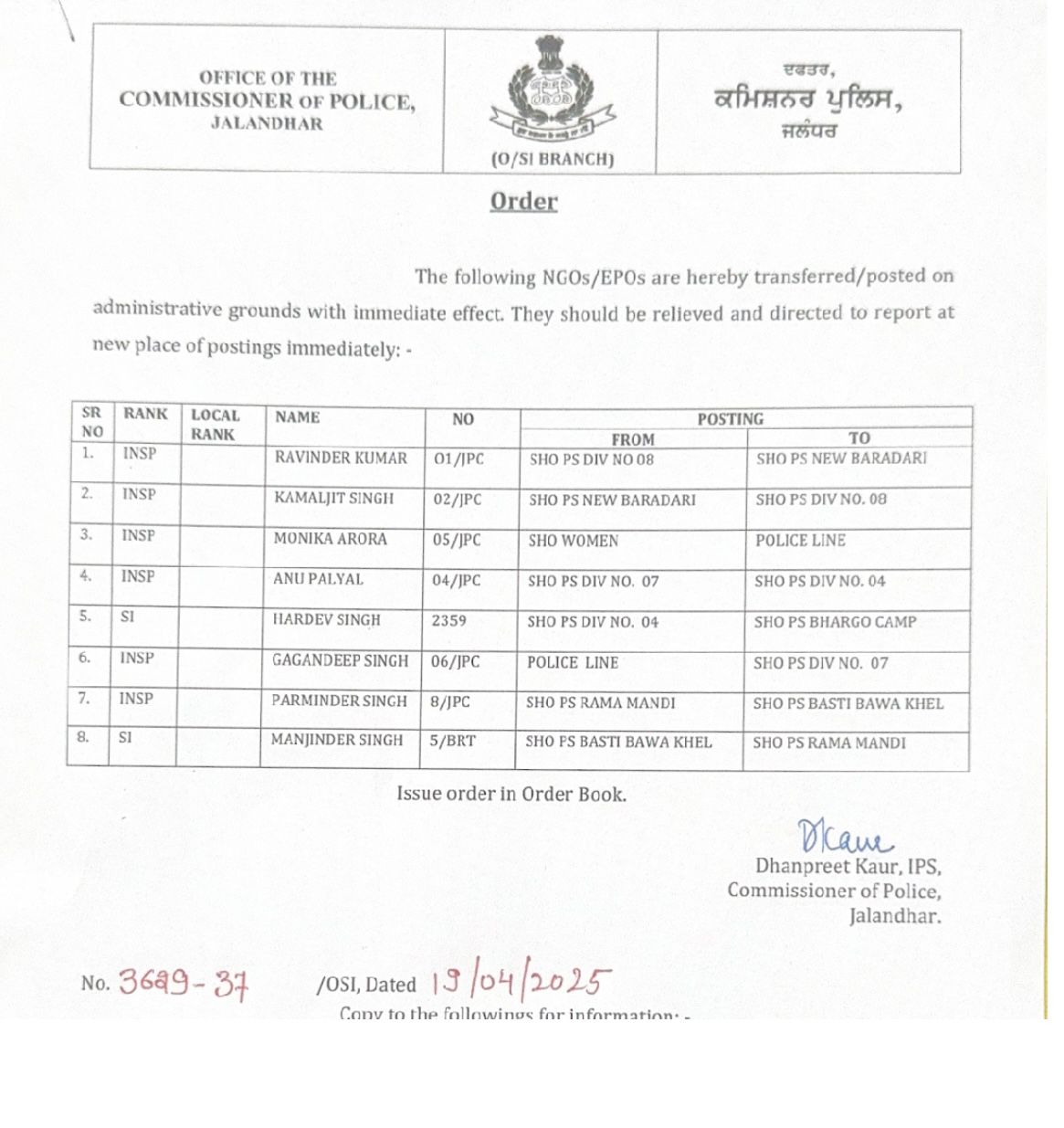 ਖਬਰਿਸਤਾਨ ਨੈੱਟਵਰਕ- ਜਲੰਧਰ ਵਿੱਚ ਪੁਲਸ ਕਮਿਸ਼ਨਰ ਧਨਪ੍ਰੀਤ ਕੌਰ ਦੀ ਅਗਵਾਈ ਵਿੱਚ ਕਈ ਥਾਣਿਆਂ ਦੇ ਐਸਐਚਓਜ਼ ਦੇ ਤਬਾਦਲੇ ਕੀਤੇ ਗਏ ਹਨ। ਜਿਨ੍ਹਾਂ ਵਿੱਚੋਂ ਥਾਣਾ ਨੰਬਰ 4, ਥਾਣਾ ਨੰਬਰ 8, ਥਾਣਾ ਨੰਬਰ 7, ਥਾਣਾ ਰਾਮਾ ਮੰਡੀ, ਬਸਤੀ ਬਾਵਾ ਖੇਲ, ਨਵਾਂ ਬਾਰਾਂਦਰੀ ਦੇ ਐਸਐਚਓ ਸ਼ਾਮਲ ਹਨ।