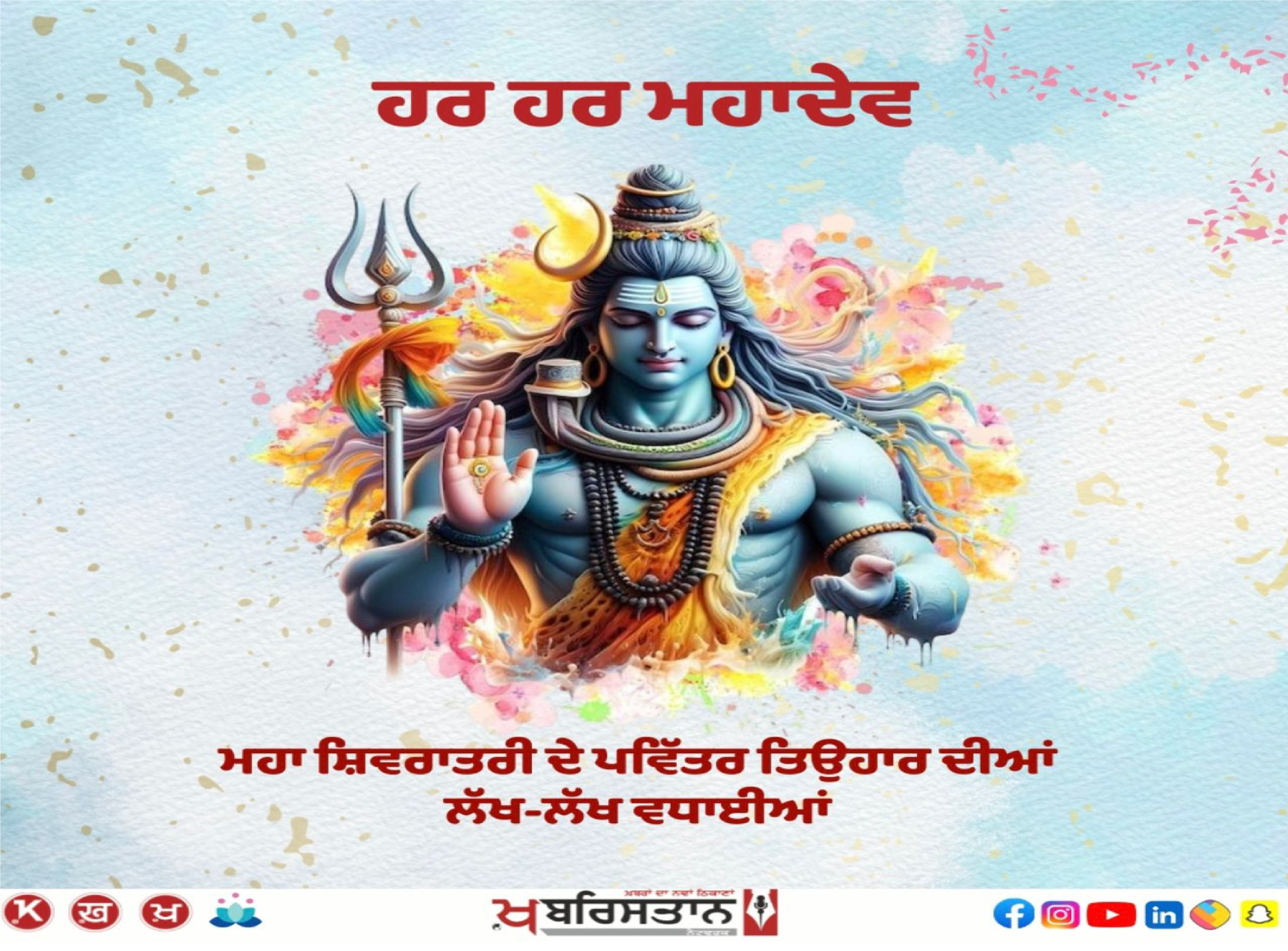 ਸਾਰੇ ਪਾਸੇ ਅੱਜ ਮਹਾਸ਼ਿਵਰਾਤਰੀ ਦਾ ਤਿਉਹਾਰ ਬੜੀ ਧੂਮ-ਧਾਮ ਨਾਲ ਮਨਾਇਆ ਜਾ ਰਿਹਾ ਹੈ। ਜਲੰਧਰ ਸਮੇਤ ਹਰ ਜ਼ਿਲ੍ਹੇ ਹਰ ਸ਼ਹਿਰ ਵਿਚ ਸਵੇਰ ਤੋਂ ਭਗਵਾਨ ਸ਼ਿਵ ਜੀ ਦੇ ਦਰਸ਼ਨਾਂ ਲਈ ਮੰਦਰਾਂ ਦੇ ਬਾਹਰ ਲੰਬੀਆਂ ਕਤਾਰਾਂ ਲੱਗੀਆਂ ਹੋਈਆਂ ਹਨ।