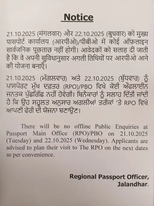ਜਲੰਧਰ ਖੇਤਰੀ ਪਾਸਪੋਰਟ ਅਫ਼ਸਰ ਨੇ ਸੂਚਿਤ ਕੀਤਾ ਹੈ ਕਿ ਦਫ਼ਤਰ ਅੱਜ (ਮੰਗਲਵਾਰ, 21 ਅਕਤੂਬਰ) ਅਤੇ ਬੁੱਧਵਾਰ (22 ਅਕਤੂਬਰ) ਬੰਦ ਰਹੇਗਾ। ਇਸ ਸਮੇਂ ਦੌਰਾਨ ਪੁੱਛਗਿੱਛ ਅਤੇ ਹੋਰ ਸਾਰੀਆਂ ਆਫ਼ਲਾਈਨ ਸੇਵਾਵਾਂ ਮੁਅੱਤਲ ਰਹਿਣਗੀਆਂ।