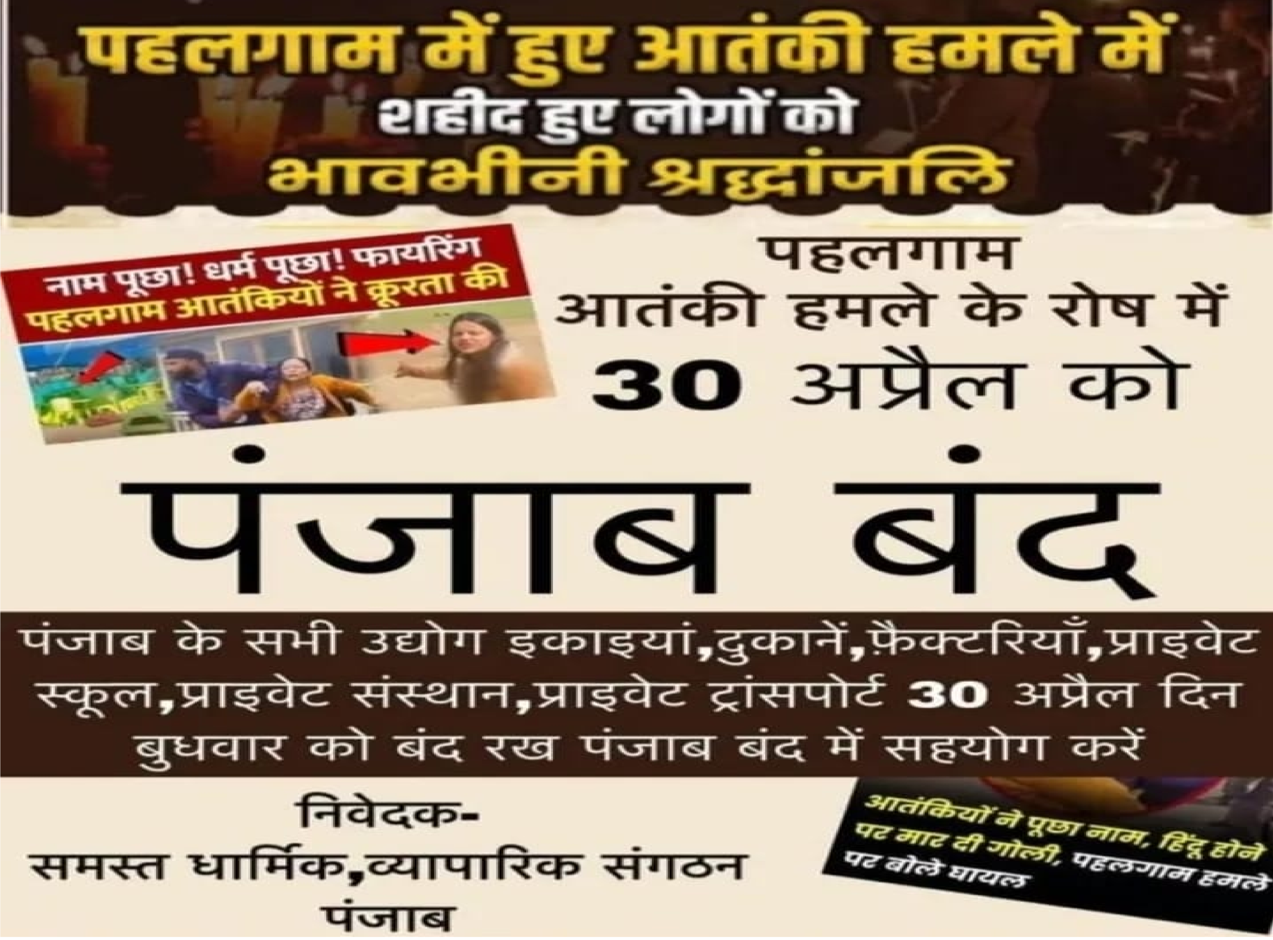 ਖਬਰਿਸਤਾਨ ਨੈੱਟਵਰਕ – ਪਹਿਲਗਾਮ ਵਿਚ ਹੋਏ ਅੱਤਵਾਦੀ ਹਮਲੇ ਵਿਚ ਮਾਰੇ ਗਏ ਲੋਕਾਂ ਨੂੰ ਸ਼ਰਧਾਂਜਲੀ ਦੇਣ ਲਈ 30 ਅਪ੍ਰੈਲ ਨੂੰ ਪੰਜਾਬ ਬੰਦ ਦੀ ਕਾਲ ਨੂੰ ਲੈ ਕੇ ਸੋਸ਼ਲ ਮੀਡੀਆ ‘ਤੇ ਇਕ ਪੋਸਟਰ ਵਾਇਰਲ ਹੋ ਰਿਹਾ ਹੈ, ਜਿਸ ਵਿਚ ਧਾਰਮਿਕ, ਵਪਾਰਕ ਸੰਗਠਨਾਂ ਦੇ ਨਾਂ ਹੇਠ 30 ਅਪ੍ਰੈਲ ਨੂੰ ਪੰਜਾਬ ਬੰਦ ਦੀ ਕਾਲ ਦਿੱਤੀ ਗਈ ਹੈ।
