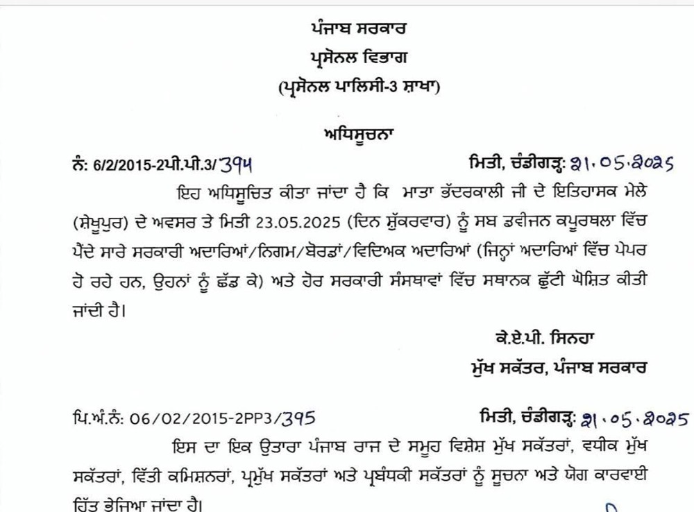 ਇਸ ਤੋਂ ਇਲਾਵਾ ਪੰਜਾਬ ਵਿੱਚ ਇੱਕ ਹੋਰ ਛੁੱਟੀ ਦਾ ਐਲਾਨ ਕੀਤਾ ਗਿਆ ਹੈ। ਹਰ ਸਾਲ ਦੀ ਤਰ੍ਹਾਂ ਇਸ ਸਾਲ ਵੀ ਕਪੂਰਥਲਾ ਜ਼ਿਲ੍ਹੇ ਦੇ ਪਿੰਡ ਸ਼ੇਖੂਪੁਰ ਵਿੱਚ ਸਥਿਤ ਮਾਤਾ ਭਦਰਕਾਲੀ ਮੰਦਿਰ ਵਿੱਚ ਮਾਤਾ ਭਦਰਕਾਲੀ ਦਾ ਮੇਲਾ ਬੜੀ ਧੂਮਧਾਮ ਨਾਲ ਮਨਾਇਆ ਜਾ ਰਿਹਾ ਹੈ। ਜਿਸ ਕਾਰਨ 23 ਮਈ ਨੂੰ ਸਾਰੇ ਸਕੂਲ ਅਤੇ ਸਰਕਾਰੀ ਦਫ਼ਤਰ ਬੰਦ ਰਹਿਣਗੇ।