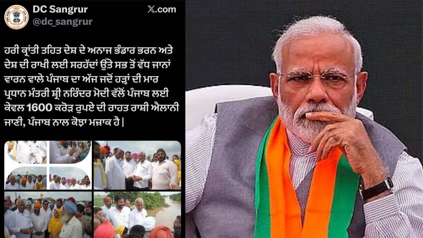 ਡਿਪਟੀ ਕਮਿਸ਼ਨਰ ਦੇ ਟਵਿੱਟਰ (X) ਹੈਂਡਲ ਤੋਂ ਇੱਕ ਪੋਸਟ ਕੀਤੀ ਗਈ ਜਿਸ ਵਿੱਚ ਲਿਖਿਆ ਸੀ ਕਿ “ਹਰਿਤ ਕ੍ਰਾਂਤੀ ਦੇ ਤਹਿਤ ਦੇਸ਼ ਦੇ ਅਨਾਜ ਭੰਡਾਰ ਭਰਨ ਅਤੇ ਸਰਹੱਦਾਂ ‘ਤੇ ਸਭ ਤੋਂ ਵੱਧ ਸ਼ਹਾਦਤਾਂ ਦੇਣ ਵਾਲਾ ਪੰਜਾਬ ਜਦੋਂ ਹੜ੍ਹ ਦੀ ਮਾਰ ਝੱਲ ਰਿਹਾ ਹੈ ਤਾਂ ਪ੍ਰਧਾਨ ਮੰਤਰੀ ਵੱਲੋਂ ਸਿਰਫ਼ ₹1600 ਕਰੋੜ ਦੀ ਰਾਹਤ ਰਕਮ ਦਾ ਐਲਾਨ ਕਰਨਾ ਪੰਜਾਬ ਨਾਲ ਵੱਡਾ ਮਜ਼ਾਕ ਹੈ।”