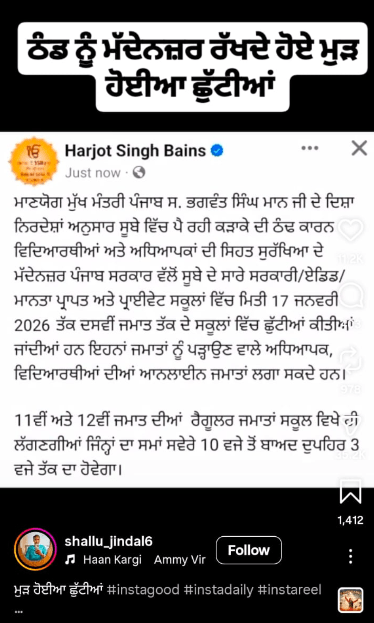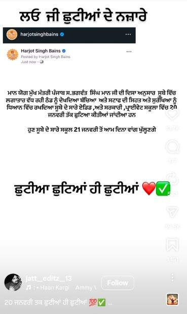ਇਸ ਦਰਮਿਆਨ ਸਿੱਖਿਆ ਮੰਤਰੀ ਹਰਜੋਤ ਬੈਂਸ ਦੇ ਨਾਂਅ ਨਾਲ ਇੱਕ ਪੋਸਟ ਸੋਸ਼ਲ ਮੀਡੀਆ ‘ਤੇ ਕਾਫ਼ੀ ਵਾਇਰਲ ਹੋ ਰਹੀ ਹੈ, ਜਿਸ ਵਿੱਚ 21 ਜਨਵਰੀ ਤੱਕ ਸਕੂਲਾਂ ਦੀਆਂ ਛੁੱਟੀਆਂ ਦੇ ਆਦੇਸ਼ ਦੱਸੇ ਜਾ ਰਹੇ ਹਨ। ਪਰ ਜਾਂਚ ਵਿੱਚ ਸਾਹਮਣੇ ਆਇਆ ਹੈ ਕਿ ਇਹ ਪੋਸਟ ਫਰਜ਼ੀ ਹੈ। ਇਹ ਪੋਸਟ jatt_editz_13 ਨਾਮਕ ਅਕਾਊਂਟ ਵੱਲੋਂ ਬਣਾਈ ਗਈ ਸੀ।