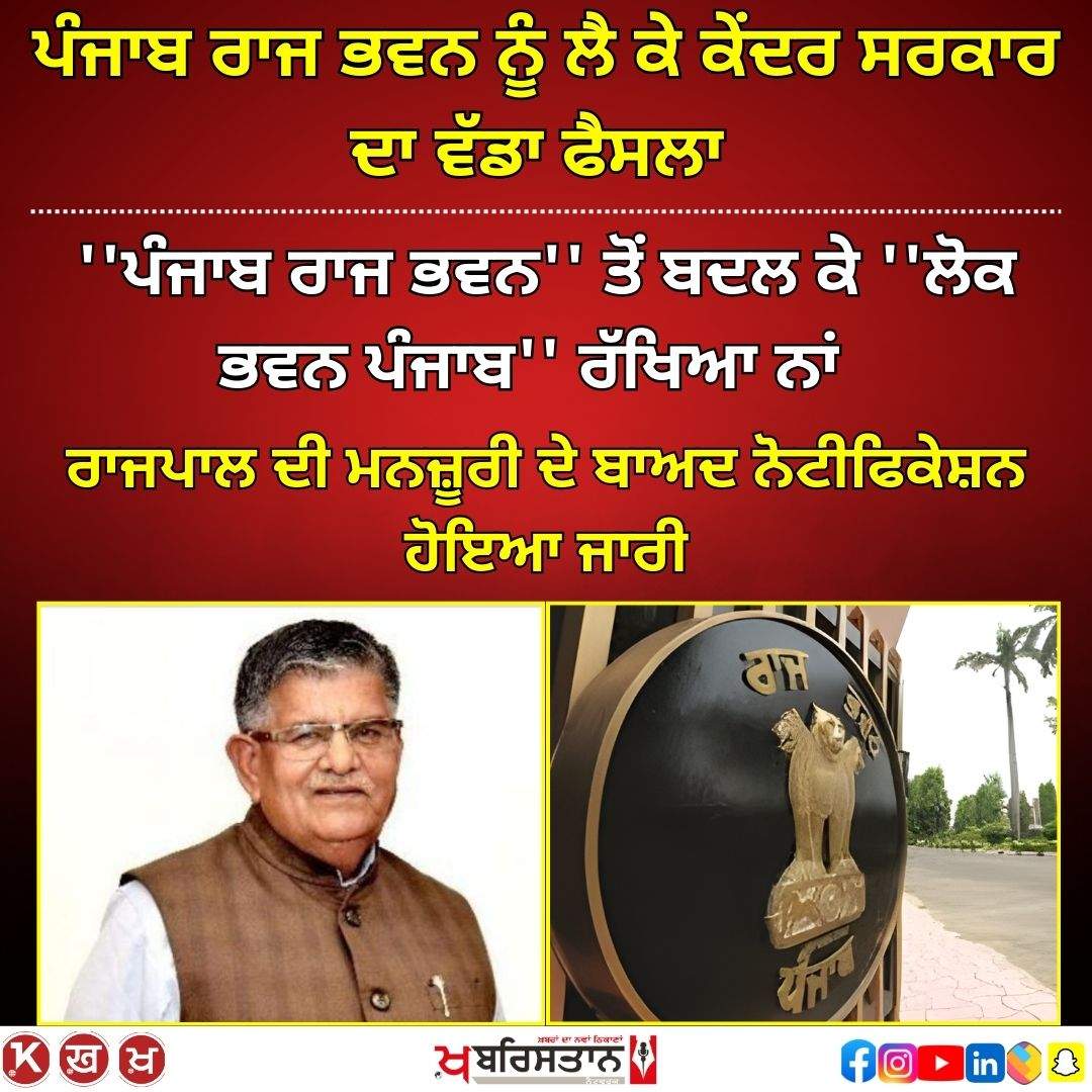 ਕੇਂਦਰ ਸਰਕਾਰ ਦੇ ਨਿਰਦੇਸ਼ਾਂ ’ਤੇ ਪੰਜਾਬ ਰਾਜ ਭਵਨ ਦਾ ਨਾਮ ਬਦਲ ਕੇ ਪੰਜਾਬ ਲੋਕ ਭਵਨ ਰੱਖ ਦਿੱਤਾ ਗਿਆ ਹੈ। ਅੱਜ ਪੰਜਾਬ ਦੇ ਰਾਜਪਾਲ ਵੱਲੋਂ ਪ੍ਰਵਾਨਗੀ ਦੇਣ ਤੋਂ ਬਾਅਦ ਰਾਜ ਭਵਨ ਦਾ ਨਾਮ ਬਦਲਣ ਲਈ ਰਾਜਪਾਲ ਦੇ ਪ੍ਰਮੁੱਖ ਸਕੱਤਰ ਨੇ ਆਦੇਸ਼ ਵੀ ਜਾਰੀ ਕਰ ਦਿੱਤੇ ਹਨ। ਹੁਣ ਚੰਡੀਗੜ੍ਹ ਸਥਿਤ ਪੰਜਾਬ ਰਾਜ ਭਵਨ ਨੂੰ ਪੰਜਾਬ ਲੋਕ ਭਵਨ ਦੇ ਨਾਮ ਨਾਲ ਹੀ ਜਾਣਿਆ ਜਾਵੇੇਗਾ। ਰਾਜਪਾਲ ਦੀ ਮਨਜ਼ੂਰੀ ਦੇ ਬਾਅਦ ਨੋਟੀਫਿਕੇਸ਼ਨ ਵੀ ਜਾਰੀ ਕੀਤਾ ਗਿਆ ਹੈ।
