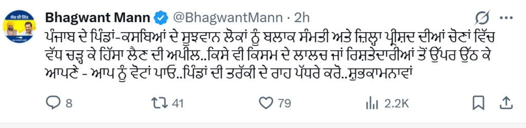 ਇਸ ਮੌਕੇ ਮੁੱਖ ਮੰਤਰੀ ਭਗਵੰਤ ਸਿੰਘ ਮਾਨ ਨੇ ਪੰਜਾਬ ਦੇ ਪਿੰਡਾਂ-ਕਸਬਿਆਂ ਦੇ ਸੂਝਵਾਨ ਲੋਕਾਂ ਨੂੰ ਬਲਾਕ ਸੰਮਤੀ ਅਤੇ ਜ਼ਿਲ੍ਹਾ ਪ੍ਰੀਸ਼ਦ ਦੀਆਂ ਚੋਣਾਂ ਵਿੱਚ ਵੱਧ ਚੜ੍ਹ ਕੇ ਹਿੱਸਾ ਲੈਣ ਦੀ ਅਪੀਲ ਕੀਤੀ ਹੈ। ਉਨ੍ਹਾਂ ਸੋਸ਼ਲ ਮੀਡੀਆ ਹੈਂਡਲ ਉਤੇ ਲਿਖਿਆ ਕਿ ਕਿਸੇ ਵੀ ਕਿਸਮ ਦੇ ਲਾਲਚ ਜਾਂ ਰਿਸ਼ਤੇਦਾਰੀਆਂ ਤੋਂ ਉੱਪਰ ਉੱਠ ਕੇ ਆਪ ਨੂੰ ਵੋਟਾਂ ਪਾਓ..ਪਿੰਡਾਂ ਦੀ ਤਰੱਕੀ ਦੇ ਰਾਹ ਪੱਧਰੇ ਕਰੋ..ਸ਼ੁਭਕਾਮਨਾਵਾਂ।