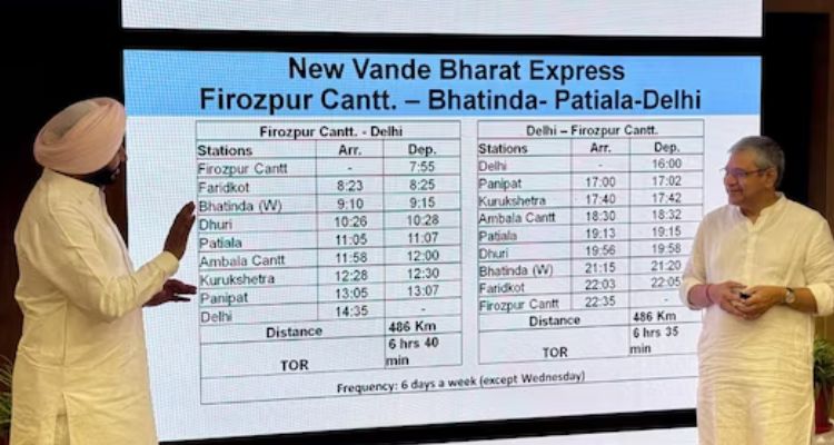 ਕੇਂਦਰੀ ਮੰਤਰੀ ਨੇ ਫਿਰੋਜ਼ਪੁਰ-ਨਵੀਂ ਦਿੱਲੀ ਵੰਦੇ ਭਾਰਤ ਟ੍ਰੇਨ ਦੀ ਸ਼ੁਰੂਆਤ ਦਾ ਵੀ ਐਲਾਨ ਕੀਤਾ, ਜਿਸ ਨੂੰ ਇਸ ਹਫ਼ਤੇ ਹਰੀ ਝੰਡੀ ਦਿਖਾਈ ਜਾਵੇਗੀ। ਇਹ ਟ੍ਰੇਨ ਬੁੱਧਵਾਰ ਨੂੰ ਛੱਡ ਕੇ ਪੂਰਾ ਹਫ਼ਤਾ ਚੱਲੇਗੀ। ਫਿਰੋਜ਼ਪੁਰ ਤੋਂ ਨਵੀਂ ਦਿੱਲੀ ਜਾਣ ਵਾਲੀ ਵੰਦੇ ਭਾਰਤ ਟ੍ਰੇਨ ਪੂਰੇ ਮਾਲਵਾ ਖੇਤਰ ਨੂੰ ਦਿੱਲੀ ਨਾਲ ਵੀ ਜੋੜੇਗੀ। ਇਹ ਫਿਰੋਜ਼ਪੁਰ ਤੋਂ ਬਠਿੰਡਾ, ਧੂਰੀ, ਪਟਿਆਲਾ, ਅੰਬਾਲਾ ਅਤੇ ਨਵੀਂ ਦਿੱਲੀ ਤੱਕ ਚੱਲੇਗੀ।