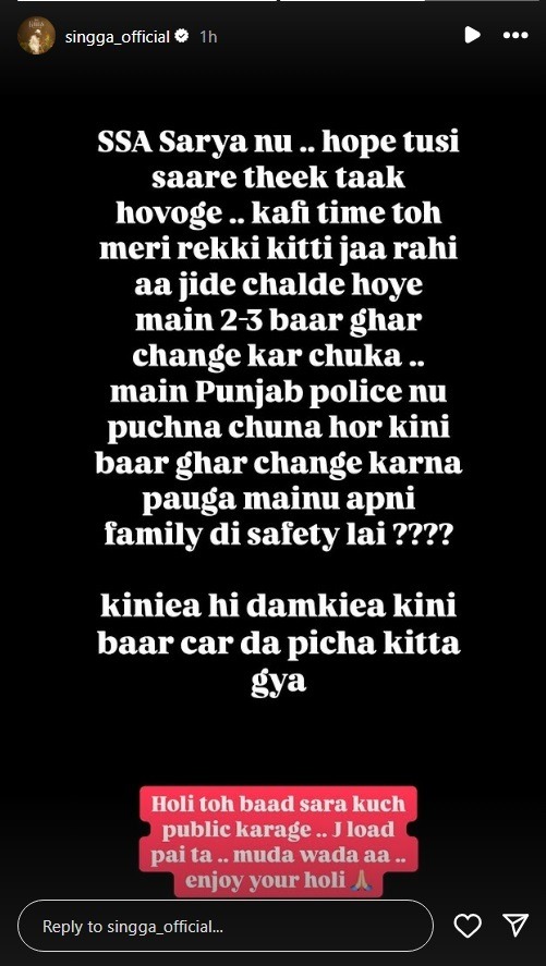 ਸਿੰਗਾ ਨੇ ਪੋਸਟ ਕਰ ਲਿਖਿਆ ਕਿ ਉਸ ਦੀ ਰੇਕੀ ਕੀਤੀ ਜਾ ਰਹੀ ਹੈ। ਇਸ ਕਾਰਨ ਉਹ ਆਪਣਾ ਘਰ ਕਈ ਵਾਰ ਬਦਲ ਚੁੱਕਾ ਹੈ। ਉਸ ਨੇ ਪੋਸਟ ਵਿੱਚ ਅੱਗੇ ਲਿਖਿਆ ਕਿ ਉਹ ਹੋਲੀ ਤੋਂ ਬਾਅਦ ਇਹ ਸਭ ਜਨਤਕ ਕਰਨਗੇ। ਉਨ੍ਹਾਂ ਦੀ ਪੋਸਟ ਤੋਂ ਬਾਅਦ ਪੁਲਿਸ ਪ੍ਰਸ਼ਾਸਨ ‘ਤੇ ਸਵਾਲ ਖੜ੍ਹੇ ਹੋ ਰਹੇ ਹਨ।