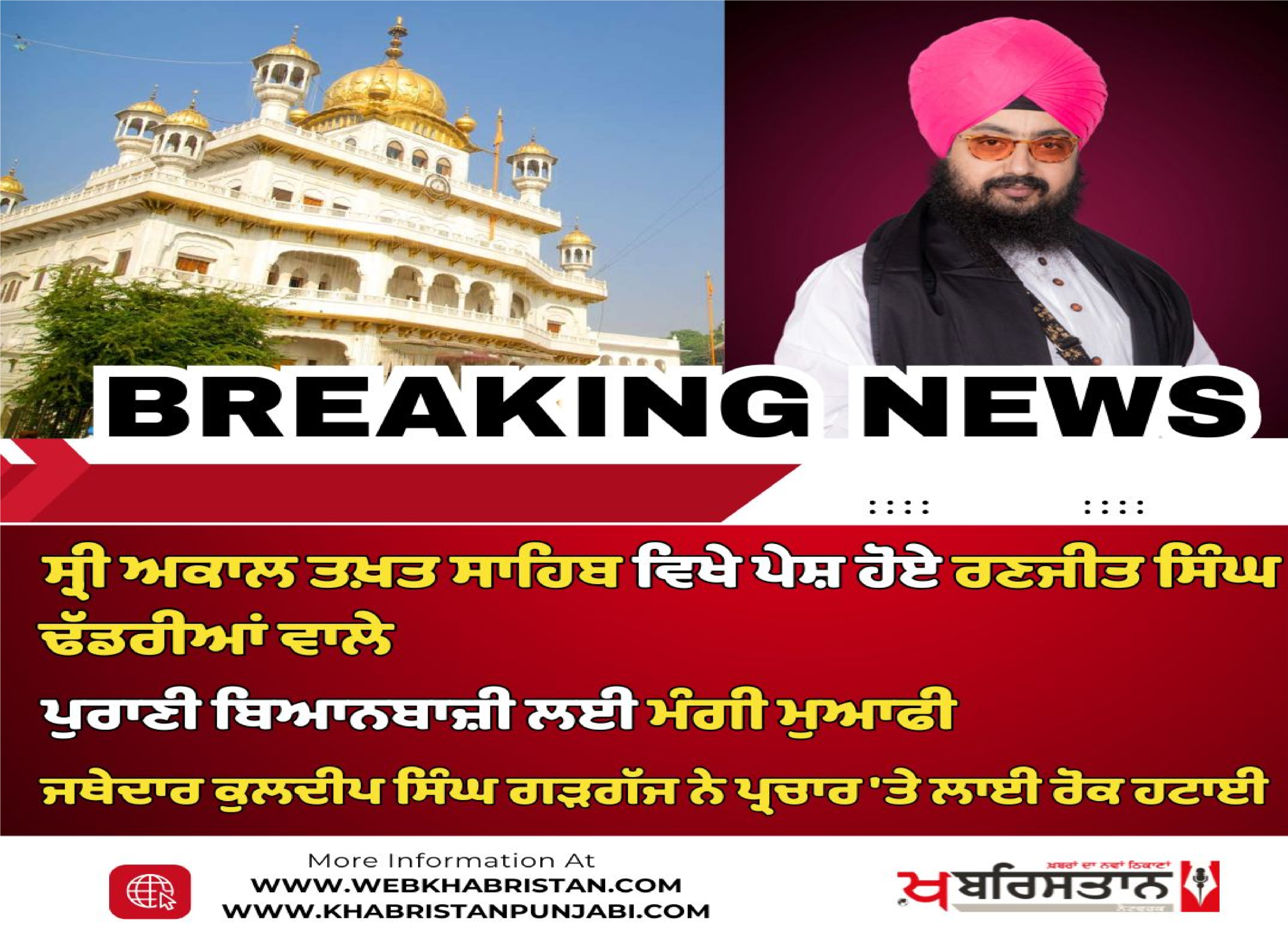 ਰਣਜੀਤ ਸਿੰਘ ਢੱਡਰੀਆਂ ਵਾਲਾ ਨੇ ਕਿਹਾ ਕਿ ਪੰਜਾਬ ਵਿੱਚ ਧਰਮ ਪਰਿਵਰਤਨ ਤੇ ਨਸ਼ੇ ਵਿਚ ਫਸ ਰਹੇ ਨੌਜਵਾਨਾਂ ਨੂੰ ਬਾਹਰ ਕੱਢਣ ਲਈ ਇਕਜੁੱਟ ਹੋਣ ਦੀ ਲੋੜ ਹੈ ਤੇ ਇਸ ਲਈ ਉਨ੍ਹਾਂ ਨੇ ਖਿਮਾ ਦੀ ਯਾਚਨਾ ਕੀਤੀ ਹੈ।ਸ੍ਰੀ ਅਕਾਲ ਤਖ਼ਤ ਸਾਹਿਬ ਦੀ ਫ਼ਸੀਲ ਤੋਂ ਫ਼ੈਸਲਾ ਸੁਣਾਉਂਦਿਆਂ ਜਥੇਦਾਰ ਗਿਆਨੀ ਕੁਲਦੀਪ ਸਿੰਘ ਗੜਗੱਜ ਨੇ ਕਿਹਾ ਕਿ ਪੰਜ ਸਿੰਘ ਸਾਹਿਬਾਨ ਨੇ ਰਣਜੀਤ ਸਿੰਘ ਢੱਡਰੀਆਂਵਾਲੇ ਦੀ ਖਿਮਾ ਨੂੰ ਪ੍ਰਵਾਨ ਕਰ ਲਿਆ ਹੈ। ਉਨ੍ਹਾਂ ਨੂੰ ਅਗਾਂਹ ਤੋਂ ਸਿੱਖ ਰਹਿਤ ਮਰਿਆਦਾ, ਪੰਥਕ ਰਵਾਇਤਾਂ ਤੇ ਪਰੰਪਰਾਵਾਂ ਅਨੁਸਾਰ ਸਿੱਖੀ ਪ੍ਰਚਾਰ ਕਰਨ ਦਾ ਆਦੇਸ਼ ਦਿੱਤਾ ਗਿਆ ਹੈ। ਉਨ੍ਹਾਂ ਨੂੰ ਇਹ ਵੀ ਆਦੇਸ਼ ਦਿੱਤੇ ਗਏ ਹਨ ਕਿ ਗੁਰੂ ਦੇ ਸਰੋਵਰਾਂ ਵਿਰੁੱਧ ਕੋਈ ਬਿਆਨੀ ਨਾ ਕੀਤੀ ਜਾਵੇ, ਸਾਖੀਆਂ ਤੇ ਗੁਰ ਇਤਿਹਾਸ ਸੁਣਾਇਆ ਜਾਵੇ, ਸਮੁੱਚੀ ਸਿੱਖ ਕੌਮ ਨੂੰ ਇਕਜੁੱਟ ਕਰਨ ਦੇ ਉਪਰਾਲੇ ਕੀਤੇ ਜਾਣ, ਕਿਸੇ ਜਥੇਬੰਦੀ ਖ਼ਿਲਾਫ਼ ਨਿੱਜੀ ਟਿਪਣੀਆਂ ਨਾ ਕੀਤੀਆਂ ਜਾਣ।