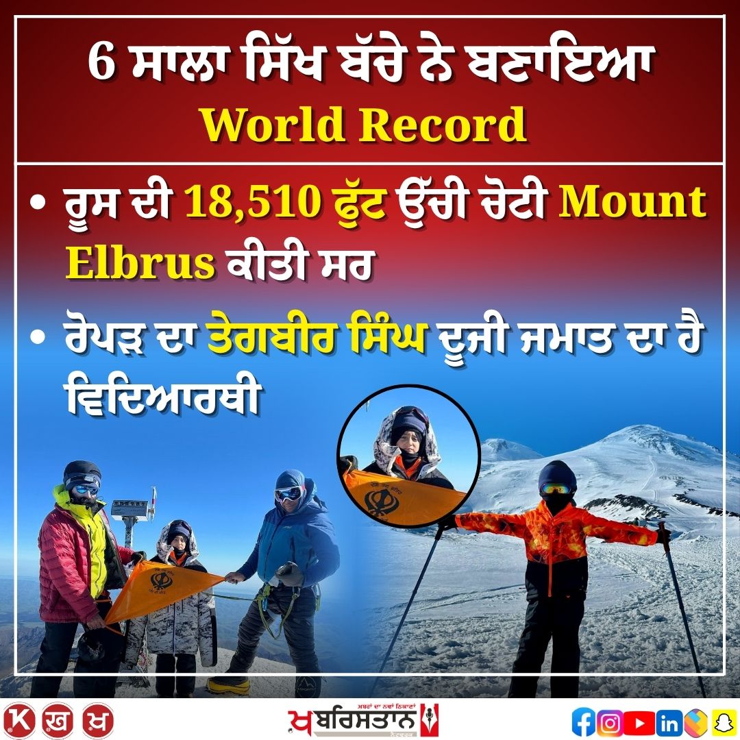 ਖ਼ਬਰਿਸਤਾਨ ਨੈੱਟਵਰਕ: ਰੂਸ ਵਿੱਚ ਸਥਿਤ ਮਾਊਂਟ ਐਲਬਰਸ 18510 ਫੁੱਟ ਦੀ ਉਚਾਈ ‘ਤੇ ਸਥਿਤ ਹੈ| ਜਿਸ ਨੂੰ ਰੋਪੜ ਦੇ ਤੇਗਬੀਰ ਨੇ 6 ਸਾਲਾ ਦੀ ਉਮਰ ‘ਚ ਹੀ ਸਰ ਕਰ ਨਵਾਂ ਵਿਸ਼ਵ ਰਿਕਾਰਡ ਬਣਾਇਆ ਹੈ| ਤੇਗਬੀਰ ਸਿੰਘ ਰੋਪੜ ਦੇ ਵਿੱਚ ਇਕ ਨਾਮੀ ਨਿੱਜੀ ਸਕੂਲ ਦਾ ਦੂਜੀ ਜਮਾਤ ਦਾ ਵਿਦਿਆਰਥੀ ਹੈ । ਉਸ ਨੂੰ ਮਾਊਂਟੇਨ ਕਲਾਈਮਿੰਗ ਸਰਟੀਫਿਕੇਟ ਅਤੇ ਮੈਡਲ ਨਾਲ ਸਨਮਾਨਤ ਕੀਤਾ ਗਿਆ।