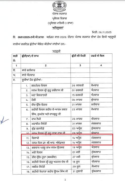ਖ਼ਬਰਿਸਤਾਨ ਨੈੱਟਵਰਕ:ਪੰਜਾਬ ‘ਚ ਮੰਗਲਵਾਰ ਨੂੰ ਸਰਕਾਰੀ ਛੁੱਟੀ ਰਹੇਗੀ। ਇਸ ਸਾਲ ਵਿਸਾਖੀ ਦਾ ਤਿਉਹਾਰ 14 ਅਪ੍ਰੈਲ ਨੂੰ ਆ ਰਿਹਾ ਹੈ। ਜਿਸ ਦੇ ਮੱਦੇਨਜ਼ਰ ਇਸ ਦਿਨ ਸਾਰੇ ਸਕੂਲ ਕਾਲਜ ਬੰਦ ਰਹਿਣਗੇ। ਇਸ ਦਾ ਨੋਟੀਫੀਕੇਸ਼ਨ ਵੀ ਜਾਰੀ ਕੀਤਾ ਗਿਆ ਹੈ।