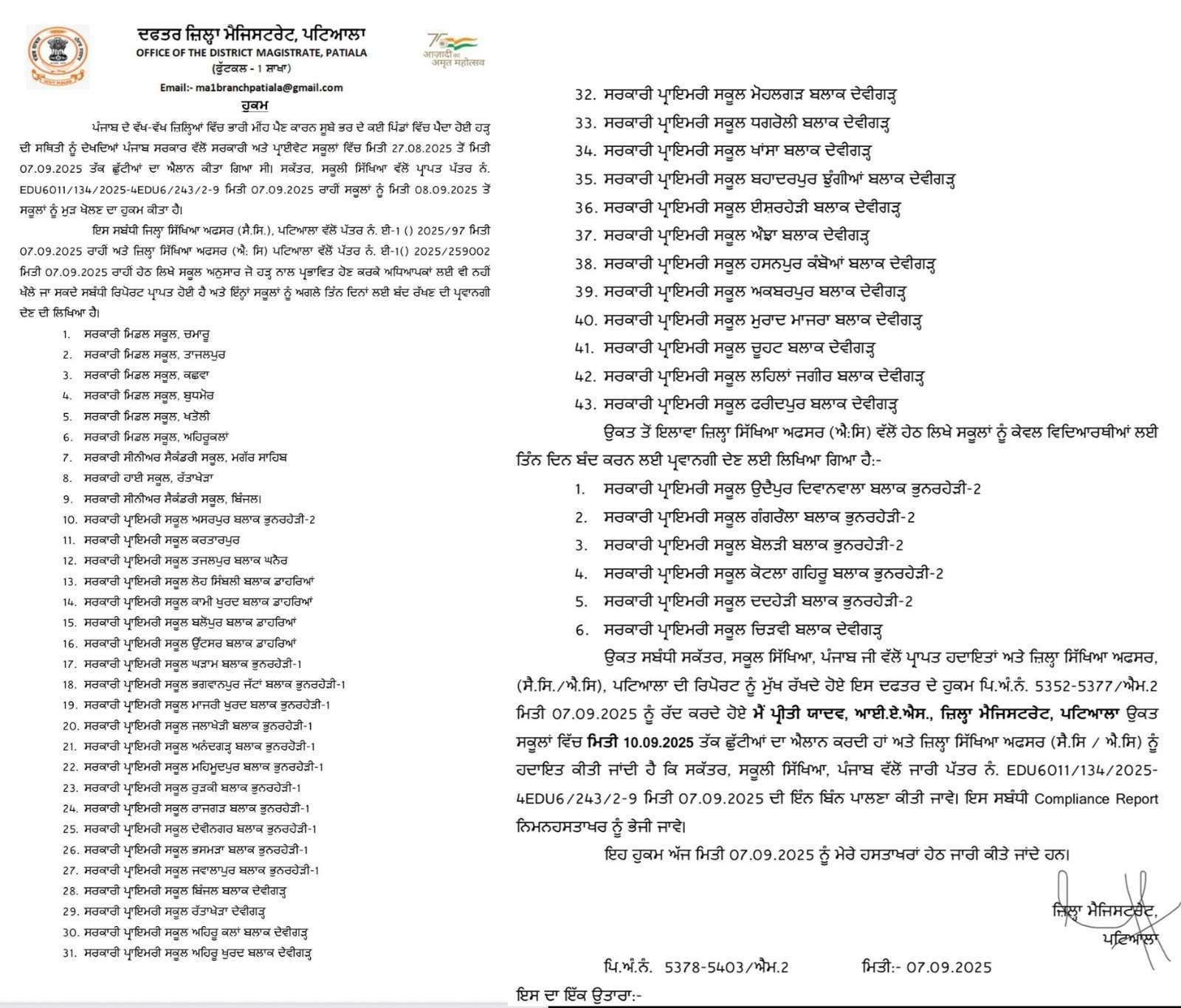 ਖਬਰਿਸਤਾਨ ਨੈਟੱਵਰਕ- ਪੰਜਾਬ ਵਿਚ ਵੈਸੇ ਤਾਂ 9 ਸਤੰਬਰ ਤੋਂ ਸਾਰੇ ਸਕੂਲ ਕਾਲਜ ਪੂਰੀ ਤਰ੍ਹਾਂ ਨਾਲ ਖੁੱਲ੍ਹ ਰਹੇ ਹਨ ਪਰ ਉਥੇ ਹੀ ਡਿਪਟੀ ਕਮਿਸ਼ਨਰ ਪਟਿਆਲਾ ਡਾ. ਪ੍ਰੀਤੀ ਯਾਦਵ ਵਲੋਂ ਜਾਰੀ ਹੁਕਮਾਂ ਮੁਤਾਬਕ ਹੜ੍ਹਾਂ ਕਰਕੇ ਪਟਿਆਲਾ ਜ਼ਿਲ੍ਹੇ ਦੇ 43 ਸਕੂਲ ਅਧਿਆਪਕਾਂ ਤੇ ਵਿਦਿਆਰਥੀਆਂ ਲਈ 10 ਸਤੰਬਰ ਤੱਕ ਬੰਦ ਰਹਿਣਗੇ ਜਦਕਿ 6 ਸਕੂਲਾਂ ਨੂੰ ਸਿਰਫ਼ ਵਿਦਿਆਰਥੀਆਂ ਲਈ ਹੀ ਬੰਦ ਕੀਤਾ ਗਿਆ ਹੈ। ਇਸ ਤੋਂ ਇਲਾਵਾ ਬਾਕੀ ਨਿੱਜੀ ਤੇ ਸਰਕਾਰੀ ਸਕੂਲ ਸਰਕਾਰ ਦੇ ਹੁਕਮਾਂ ਅਨੁਸਾਰ ਹੀ ਖੁੱਲ੍ਹਣਗੇ।