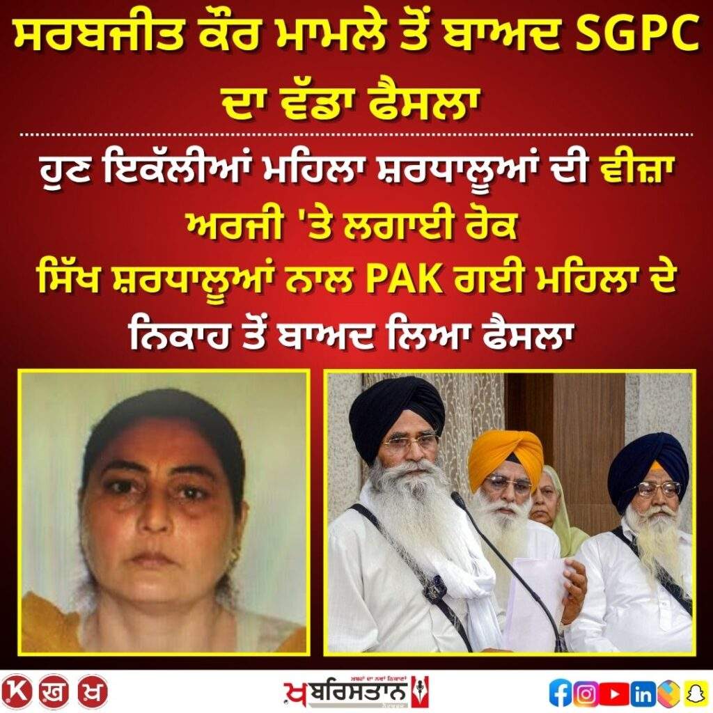 ਸ਼੍ਰੋਮਣੀ ਗੁਰਦੁਆਰਾ ਪ੍ਰਬੰਧਕ ਕਮੇਟੀ (SGPC) ਨੇ ਪਾਕਿਸਤਾਨ ਜਾਣ ਵਾਲੀਆਂ ਇਕੱਲੀਆਂ ਮਹਿਲਾ ਸ਼ਰਧਾਲੂਆਂ ਲਈ ਵੀਜ਼ਾ ਅਰਜ਼ੀਆਂ ‘ਤੇ ਸਖ਼ਤ ਨਿਯਮ ਲਾਗੂ ਕੀਤੇ ਹਨ। ਇਹ ਫੈਸਲਾ ਉਸ ਘਟਨਾ ਤੋਂ ਬਾਅਦ ਲਿਆ ਗਿਆ ਹੈ ਜਿਸ ਵਿੱਚ ਪੰਜਾਬ ਤੋਂ ਸਰਬਜੀਤ ਕੌਰ ਪਾਕਿਸਤਾਨ ਗਈ ਅਤੇ ਵਾਪਸ ਨਹੀਂ ਆਈ, ਸਗੋਂ ਆਪਣਾ ਨਾਮ ਬਦਲ ਕੇ ਉੱਥੇ ਵਿਆਹ ਕਰਵਾ ਲਿਆ।