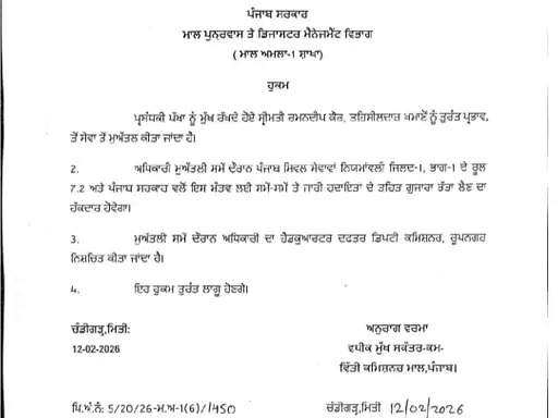 ਖ਼ਬਰਿਸਤਾਨ ਨੈੱਟਵਰਕ: ਪੰਜਾਬ ਸਰਕਾਰ ਨੇ ਵੱਡਾ ਐਕਸ਼ਨ ਲੈਂਦਿਆਂ ਜ਼ਿਲ੍ਹਾ ਫਤਿਹਗੜ੍ਹ ਸਾਹਿਬ ਦੀ ਖਮਾਣੋਂ ਦੀ ਤਹਿਸੀਲਦਾਰ ਨੂੰ ਸਸਪੈਂਡ ਕਰ ਦਿੱਤਾ ਹੈ। ਇਹ ਹੁਕਮ ਮਾਲ, ਮੁੜ ਵਸੇਬਾ ਅਤੇ ਆਫ਼ਤ ਪ੍ਰਬੰਧਨ ਵਿਭਾਗ ਵੱਲੋਂ ਜਾਰੀ ਕੀਤੇ ਗਏ ਹਨ। ਪ੍ਰਸ਼ਾਸਕੀ ਕਾਰਨਾਂ ਦਾ ਹਵਾਲਾ ਦਿੰਦੇ ਹੋਏ ਰਮਨਦੀਪ ਕੌਰ ਨੂੰ ਤੁਰੰਤ ਪ੍ਰਭਾਵ ਨਾਲ ਸੇਵਾ ਤੋਂ ਮੁਅੱਤਲ ਕਰ ਦਿੱਤਾ ਗਿਆ ਹੈ। ਮੁਅੱਤਲੀ ਦੀ ਮਿਆਦ ਦੌਰਾਨ, ਉਨ੍ਹਾਂ ਨੂੰ ਰੂਪਨਗਰ ਦੇ ਡਿਪਟੀ ਕਮਿਸ਼ਨਰ ਦਫ਼ਤਰ ਵਿੱਚ ਤਾਇਨਾਤ ਕੀਤਾ ਗਿਆ ਹੈ।