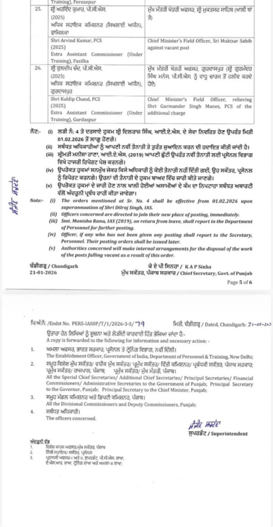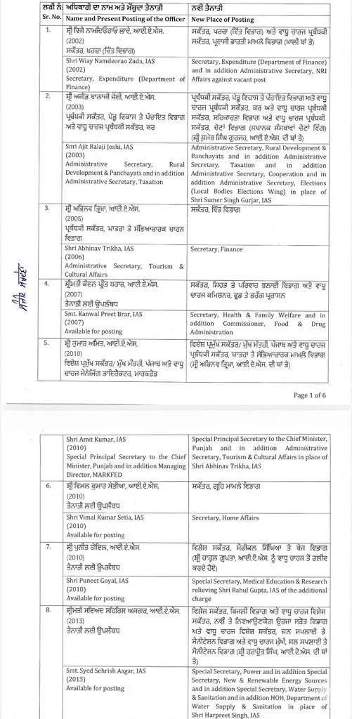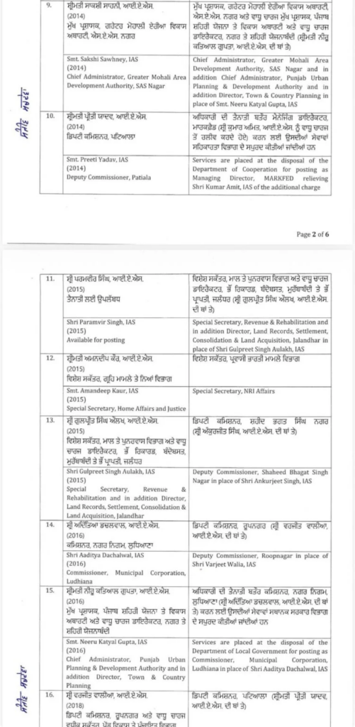 ਖਬਰਿਸਤਾਨ ਨੈੱਟਵਰਕ- ਪੰਜਾਬ ਵਿੱਚ ਅਧਿਕਾਰੀਆਂ ਦੇ ਤਬਾਦਲੇ ਜਾਰੀ ਹਨ, ਜਿੱਥੇ ਕੱਲ੍ਹ ਆਈਪੀਐਸ ਅਧਿਕਾਰੀਆਂ ਦਾ ਤਬਾਦਲਾ ਕੀਤਾ ਗਿਆ ਸੀ, ਉੱਥੇ ਹੁਣ ਆਈਏਐਸ/ਪੀਸੀਐਸ ਅਧਿਕਾਰੀਆਂ ਦਾ ਤਬਾਦਲਾ ਕਰ ਦਿੱਤਾ ਗਿਆ ਹੈ। ਸੂਚੀ ਵੀ ਜਾਰੀ ਕਰ ਦਿੱਤੀ ਗਈ ਹੈ।