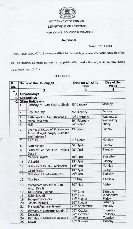 ਦਰਅਸਲ, ਇਸ ਦਿਨ ਸ੍ਰੀ ਗੁਰੂ ਨਾਭਾ ਦਾਸ ਜੀ ਦਾ ਜਨਮ ਦਿਹਾੜਾ ਮਨਾਇਆ ਜਾਵੇਗਾ। ਸੂਬਾ ਸਰਕਾਰ ਨੇ ਇਸ ਦਿਨ ਨੂੰ ਸਾਲ 2025 ਲਈ ਸਰਕਾਰੀ ਛੁੱਟੀਆਂ ਦੀ ਸੂਚੀ ਵਿੱਚ ਸ਼ਾਮਲ ਕੀਤਾ ਹੈ।