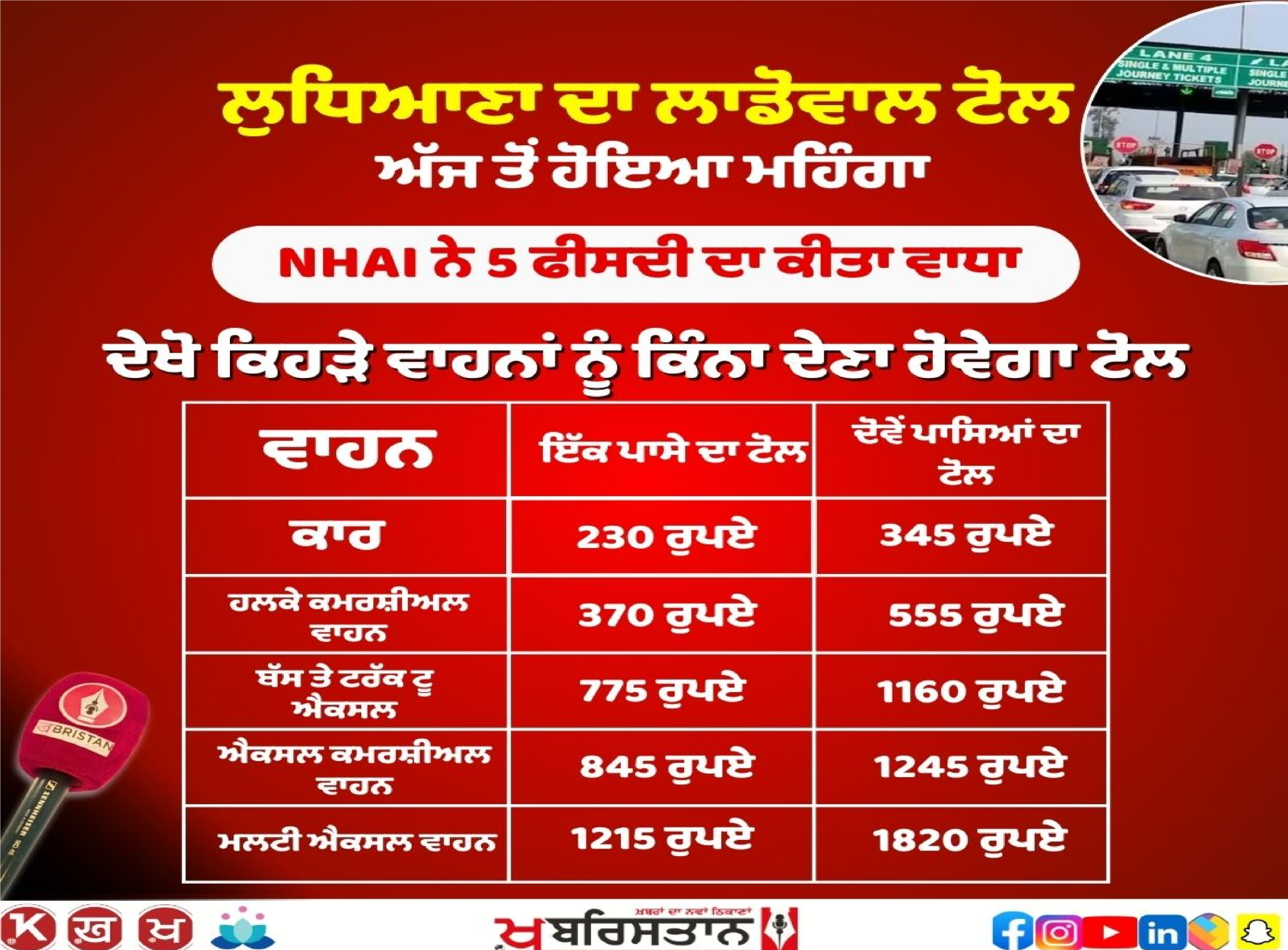 NHAI ਨੇ ਲੁਧਿਆਣਾ-ਜਲੰਧਰ ਹਾਈਵੇਅ ‘ਤੇ ਲਾਡੋਵਾਲ ਟੋਲ ਪਲਾਜ਼ਾ ‘ਤੇ ਟੋਲ ਦਰਾਂ ਵਿੱਚ 5 ਫੀਸਦੀ ਦਾ ਵਾਧਾ ਕੀਤਾ ਹੈ, ਜੋ ਕਿ ਨਵੀਆਂ ਕੀਮਤਾਂ ਅੱਜ ਤੋਂ ਲਾਗੂ ਹੋ ਗਈਆਂ ਹਨ। ਇਸ ਵਿਚ ਹਲਕੇ ਵਾਹਨ ਤੋਂ ਲੈ ਕੇ ਵੱਡੇ ਕਮਰਸ਼ੀਅਲ ਵਾਹਨਾਂ ’ਤੇ ਅਸਰ ਪਵੇਗਾ।